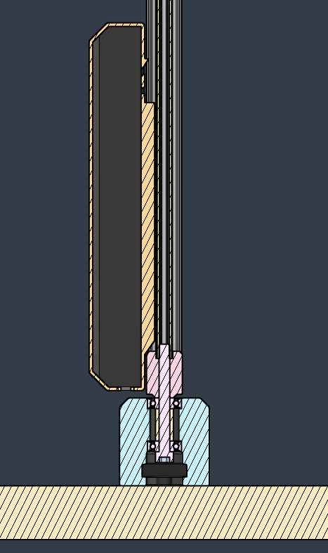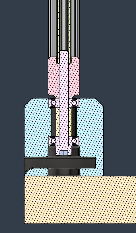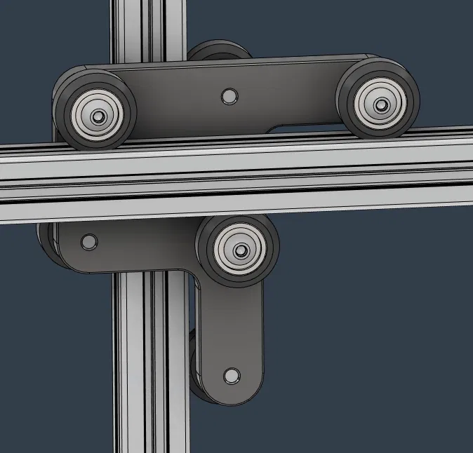 Một điểm khác biệt lớn so với đèn DIYson "nguyên bản" là không có đai ốc lệch tâm. Chỉ sử dụng các ống đệm dài 7 mm (hoặc 8 mm hoặc bất kỳ loại nào bạn có) và các con vít đi trực tiếp vào các lỗ ren trong phần chữ thập trung tâm - không cần đai ốc nào cả, các vít chịu tải ngang, không phải tải dọc, vì vậy việc in ren là cách làm đúng đắn. Độ căng để chuyển động mượt mà không có độ rơ đến từ hoa văn lỗ được nén sẵn trên phần chữ thập trung tâm (nó cần hơi biến dạng một chút để các con lăn trượt trên thanh nhôm - có thể cần điều chỉnh tỷ lệ để phù hợp với thanh nhôm của bạn).