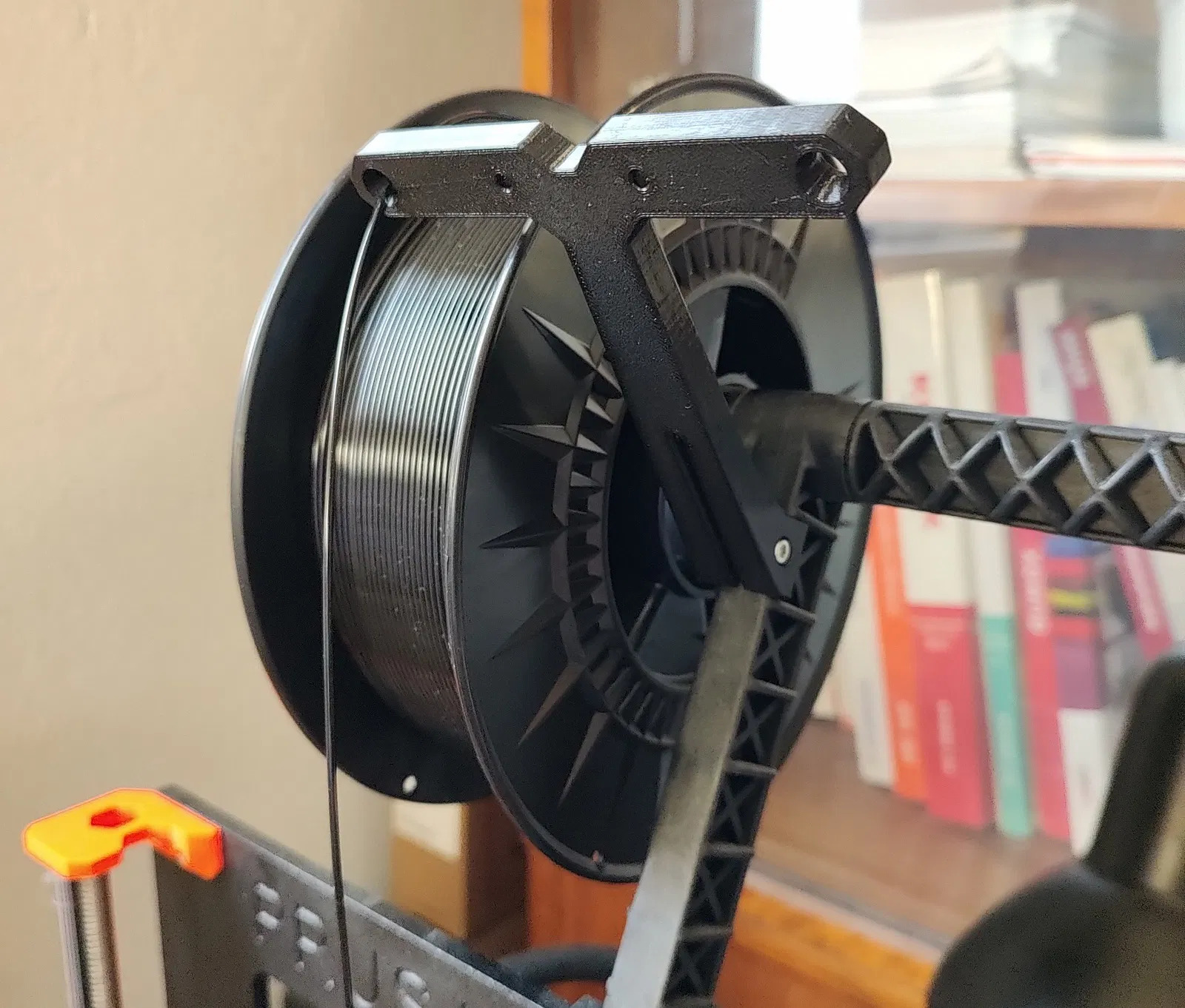 Cập nhật: Có vẻ như gặp một số vấn đề với việc dây nhựa bị trượt qua lỗ. Trong một vài trường hợp (cuộn dây bị cản nhiều và đầu đùn di chuyển nhanh) thì tính năng phát hiện va chạm (crash detection) đã được kích hoạt và làm dừng bản in. Tao đề nghị là nên cải thiện (làm mịn) bề mặt lỗ (bằng cách dùng mũi khoan), hoặc xài cái dẫn dây nhựa zin của Prusa (có xài ống PTFE) cho chắc ăn.