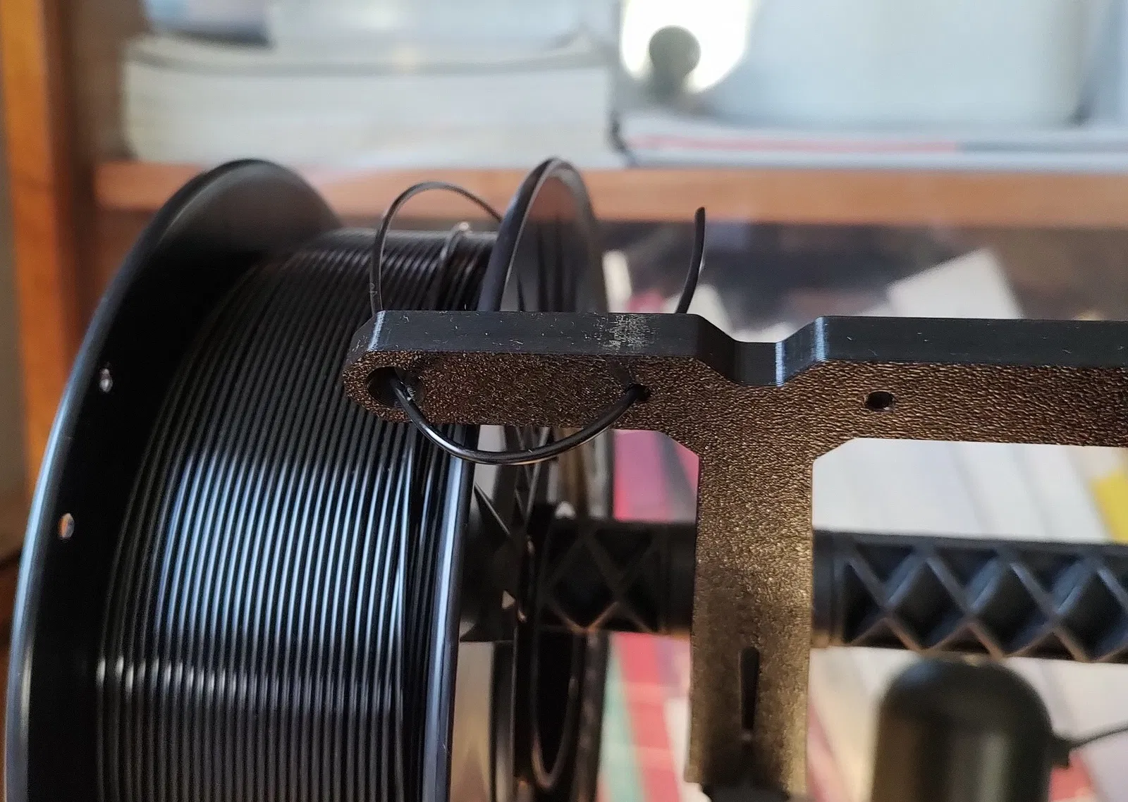 Tao đã chỉnh sửa lại cái dẫn dây nhựa (filament guide) nguyên bản từ cái MK4 để xài mà không cần ống PTFE. Vì vậy, dây nhựa sẽ đi qua một cái lỗ tròn thôi. Bạn chỉ cần một con ốc M3 và một con vít M3x18 để gắn nó lên chỗ giữ cuộn dây (spool holder) là được.