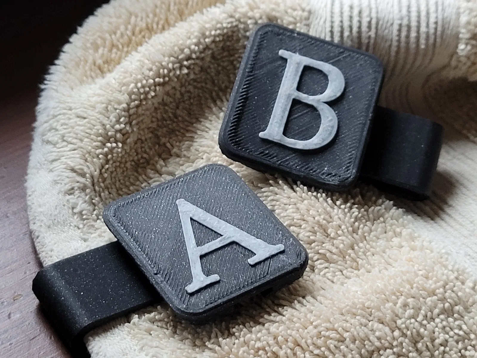 Kẹp treo khăn đơn giản giúp ghi nhãn, dễ dàng phân loại khăn đã khô. Có các tùy chọn chữ cái và số, giúp sắp xếp phòng tắm và đồ dùng gia đình gọn gàng hơn. Chất liệu PLA là đủ bền cho mục đích sử dụng này.