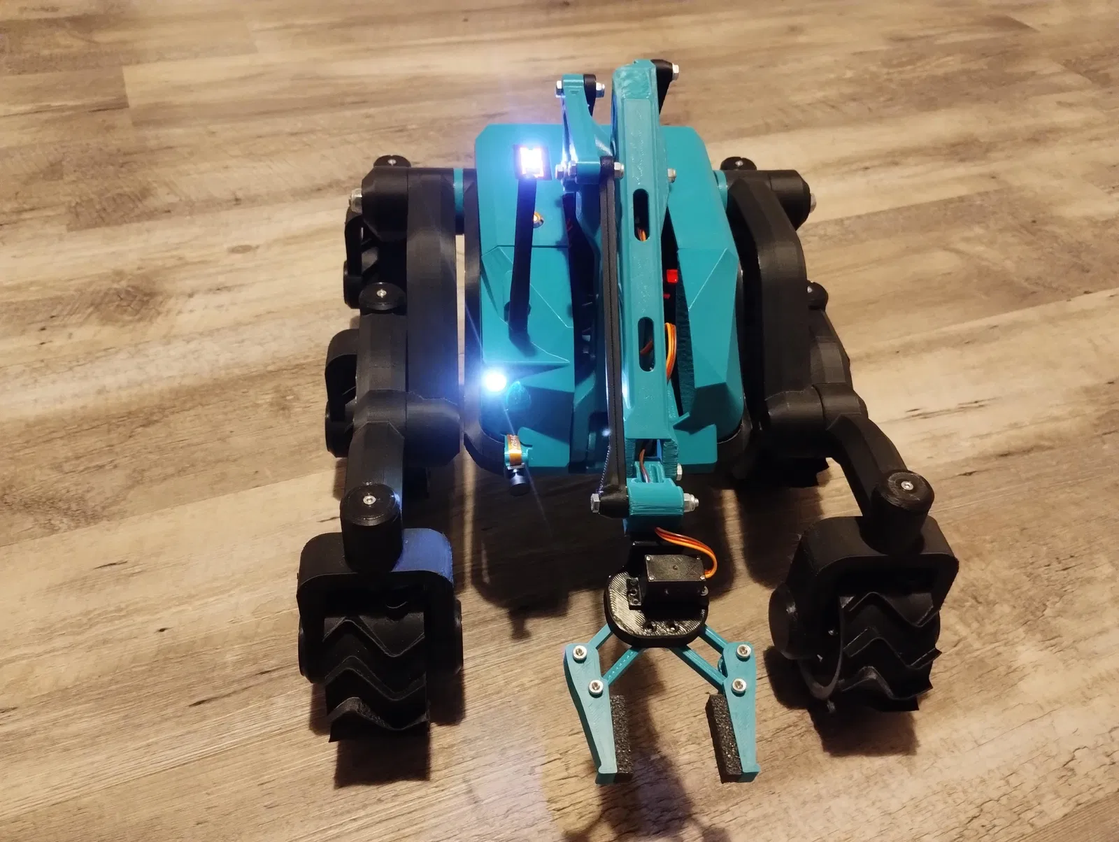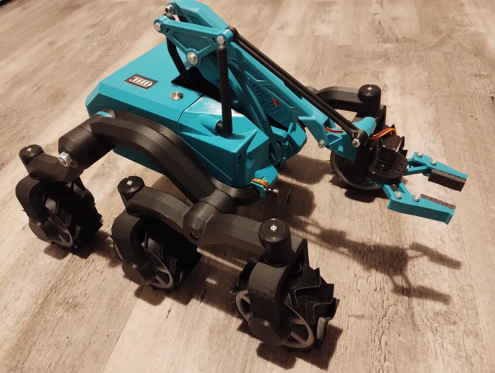 Đã sửa đổi rover leo cầu thang để mang theo cánh tay robot. Giá đỡ nằm ở khung dưới, các servo được xoay 90°, các nắp và khung có các khe hở cho cánh tay robot. ESP32 CAM với ăng-ten ngoài được gắn trong nắp trên, qua đó mọi thứ được điều khiển và camera FPV. Các cánh tay được sửa đổi cho các phiên bản không có servo. Các bánh xe được cố định như vậy và việc quay là bằng cách trượt. Các đĩa được sửa đổi để tránh nhu cầu về giá đỡ động cơ. Lốp TPE in tùy chỉnh cho độ bám tối đa, tiêu thụ vật liệu thấp và không cần giá đỡ.