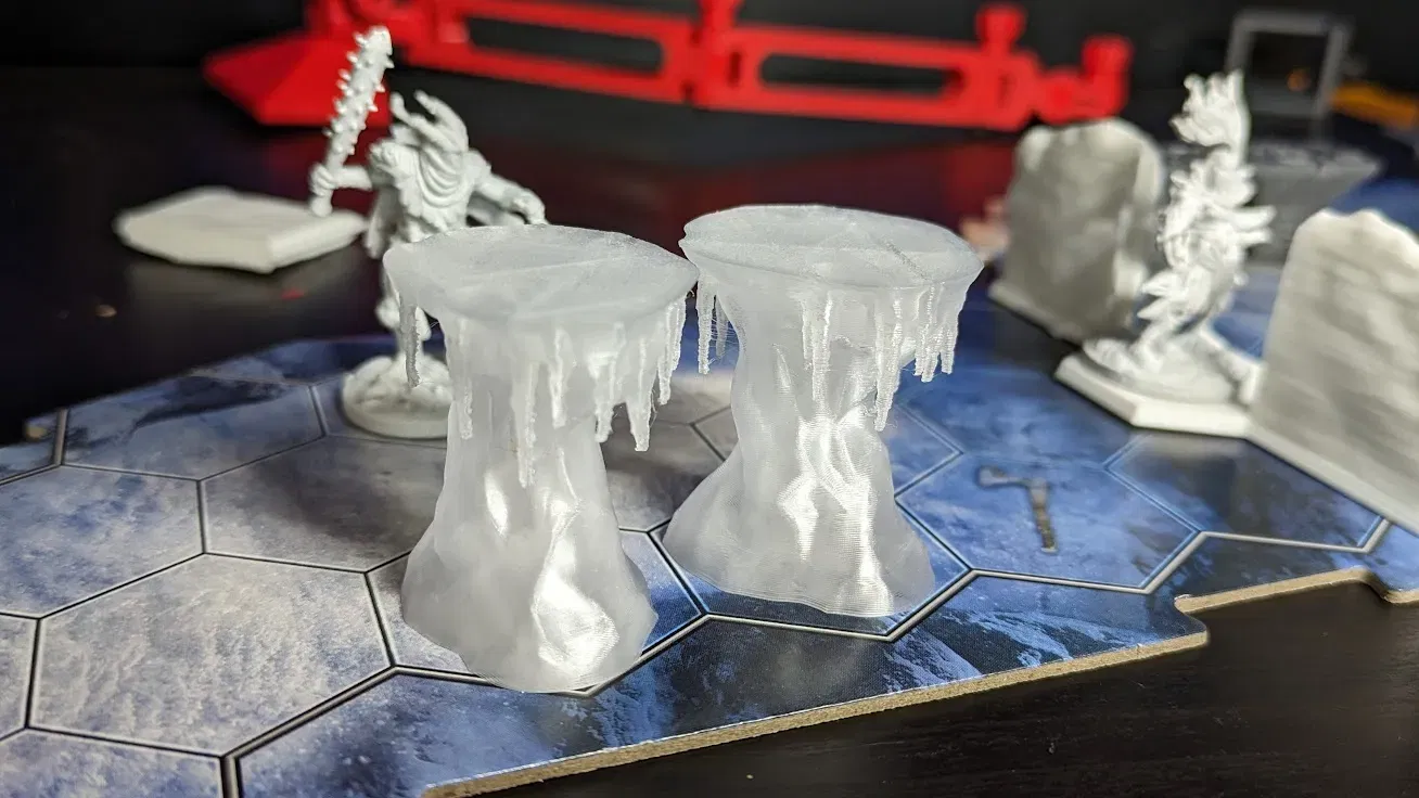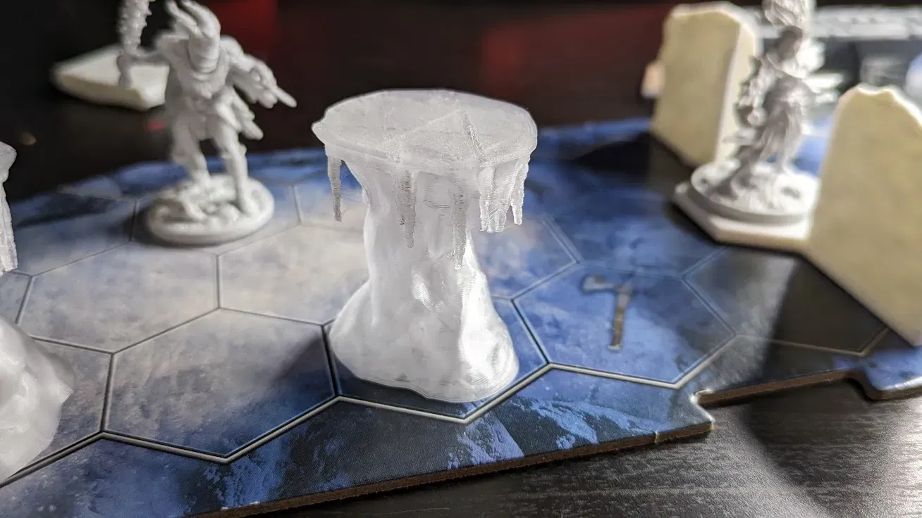 Cột băng cho Frosthaven, với đỉnh phẳng cho các quái vật nhảy/bay. Tôi in cái này bằng PETG trong suốt để có vẻ ngoài lạnh lẽo, với độ phân giải 0.12mm. Nếu bạn in ngược (các icicle hướng lên), bạn sẽ không cần hỗ trợ, tôi đã làm tất cả các độ dốc < 45 độ theo hướng đó.