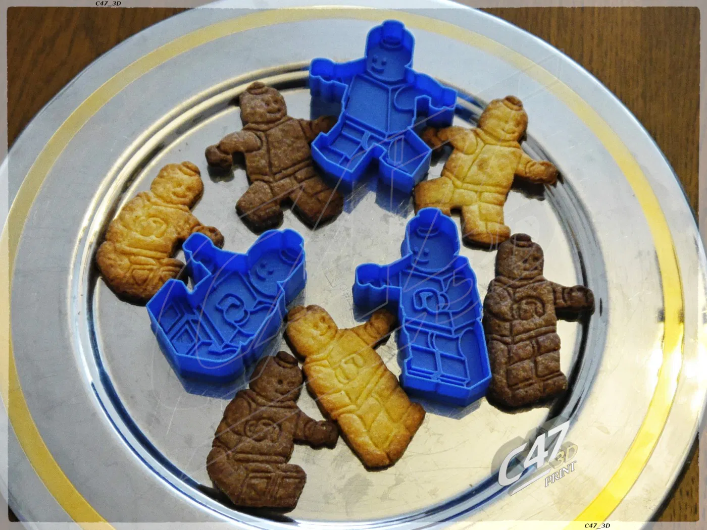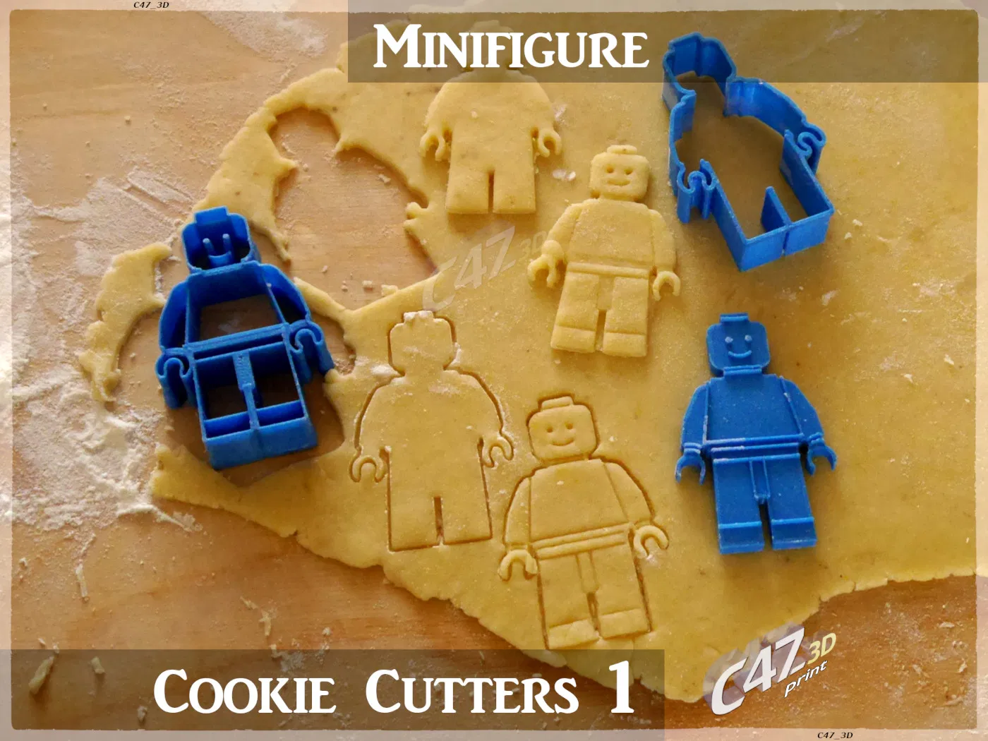 Bộ khuôn cắt bánh quy hình Minifigure, gồm 1 cái nhìn thẳng và 3 cái nhìn isometric. Dùng để làm bánh quy bơ, có công thức đi kèm. Lưu ý về cách sử dụng và các phiên bản khác nhau của mô hình.