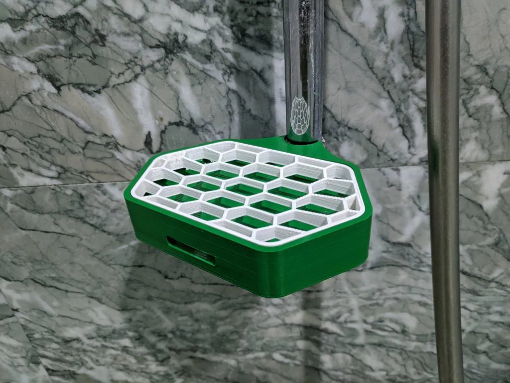 Bản phối lại (remix) thiết kế kệ xà bông giúp việc in ấn dễ dàng hơn rất nhiều. Bạn không cần dùng cấu trúc hỗ trợ, chỉ cần in ra là xài được ngay. Phiên bản trong ảnh đã được chỉnh sửa để phù hợp với hệ thống vòi sen tại nhà.