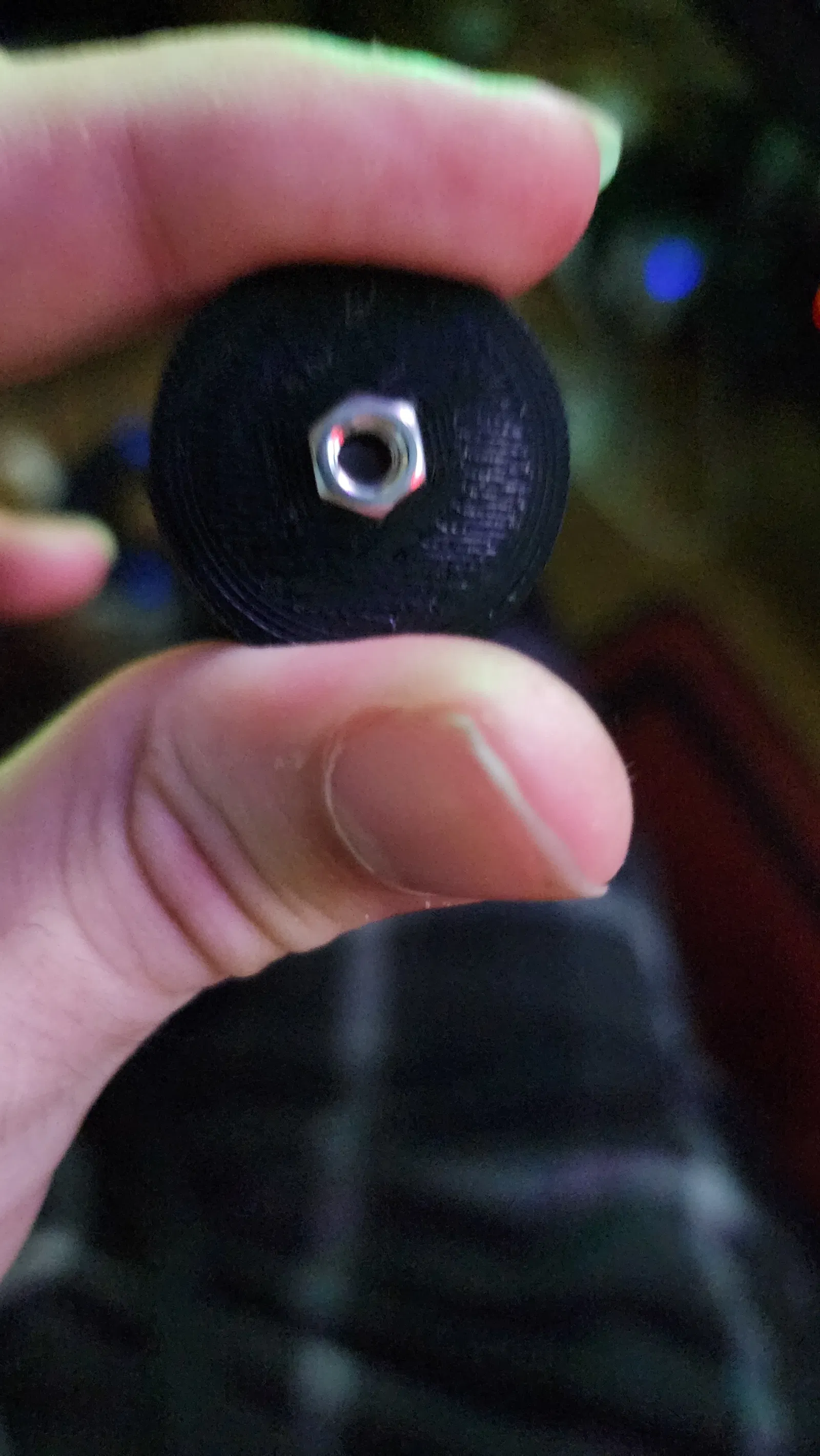 Lỗ khoét rộng nhất là 6.8mm. Đủ để dùng mỏ hàn ấn đai ốc vào. Bạn có thể phải tăng độ nở lỗ X/Y lên 0.1mm trong Orca (hoặc phần mềm tương tự) để siết chặt.