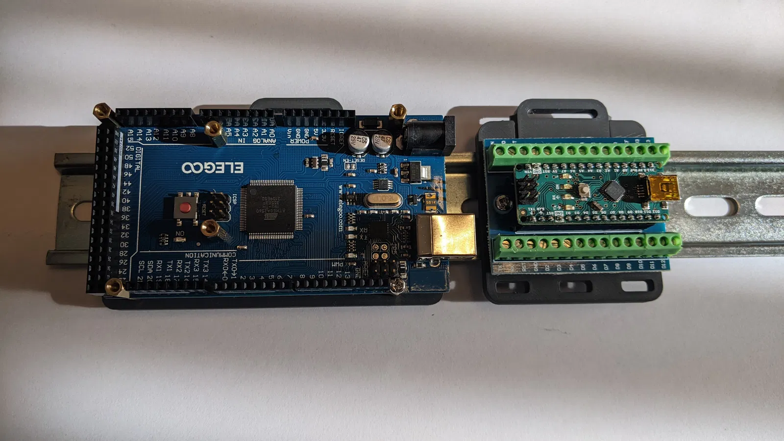 Bộ chuyển đổi gắn ray DIN cho Tấm đấu dây Arduino Nano Screw Terminal. Mẫu này cho phép bạn dễ dàng gắn module Arduino Nano của mình lên ray DIN tiêu chuẩn, rất tiện lợi cho việc lắp đặt trong tủ điện hoặc các hệ thống điều khiển công nghiệp.