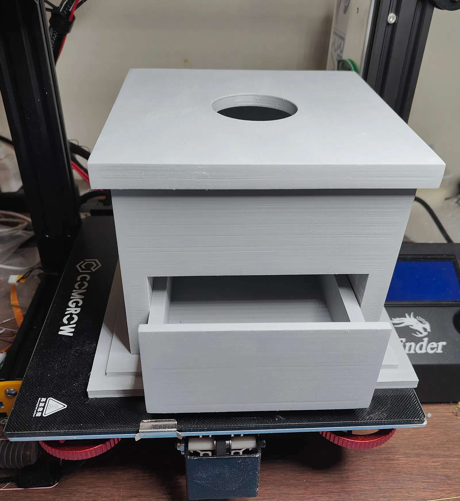 Một cái hộp có ngăn kéo để hứng bã cà phê tươi từ máy xay tay. Được thiết kế và in 3D bằng PLA, có thể nhuộm màu giả gỗ. Người dùng cần tự điều chỉnh lỗ gắn máy xay cho phù hợp.