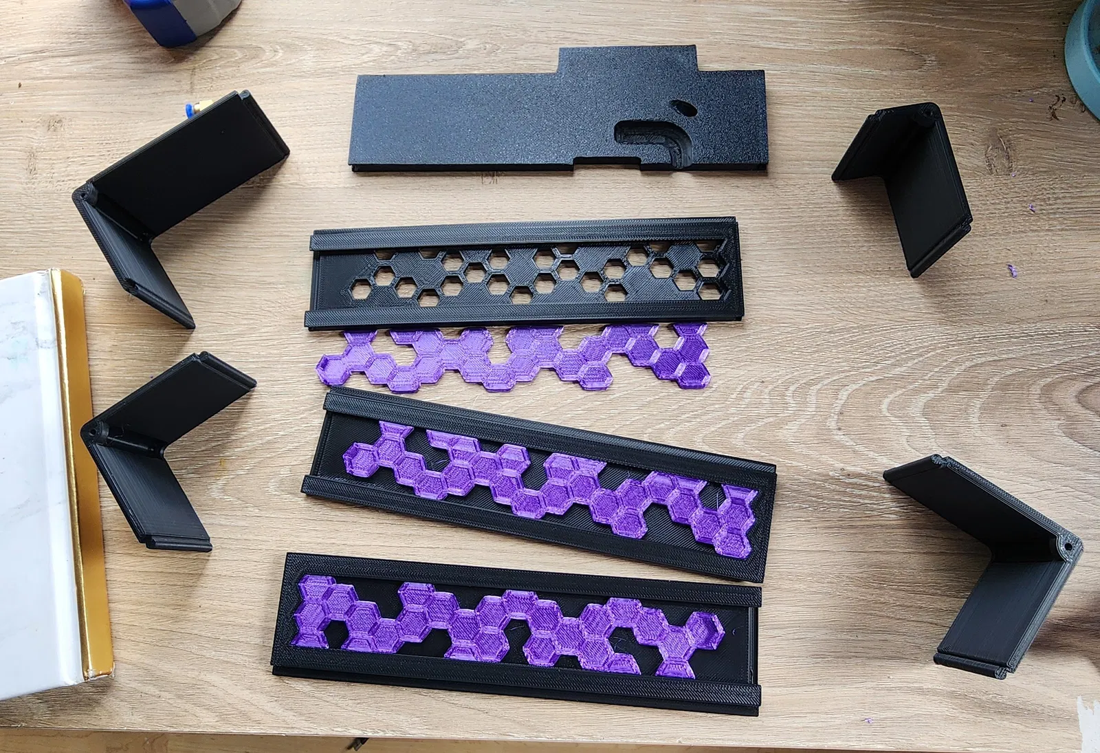 Mọi thứ đều được in bằng PLA với hỗ trợ Slim Three. In các mẫu như nguyên bản với brim để tránh bị cong vênh vì chúng là những miếng dài.