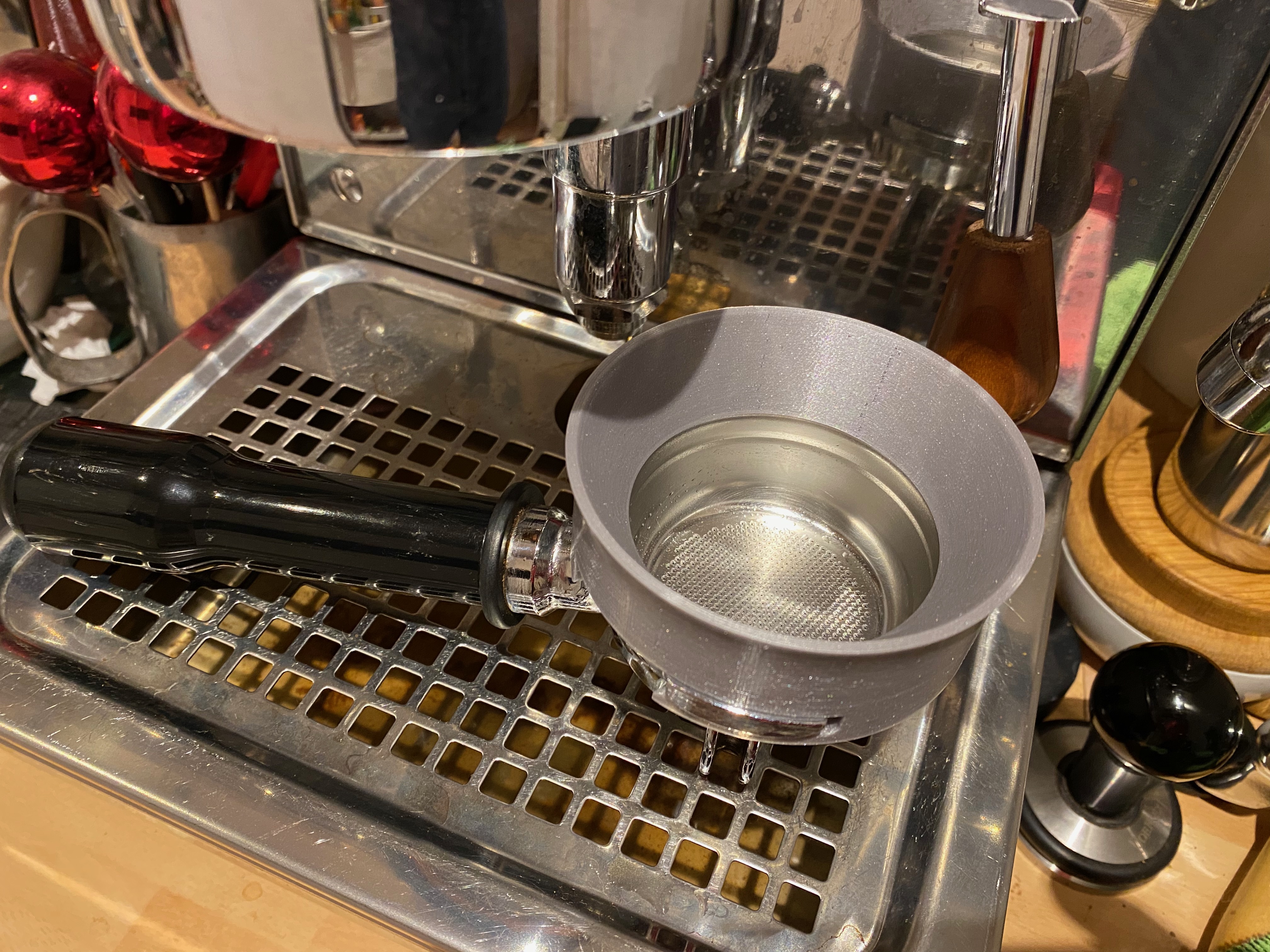 Cái phễu định lượng này được thiết kế bằng Fusion 360 để gắn vừa khít vào tay cầm porta filter E61 (58mm). Trong trường hợp này, tay cầm của Expobar đã được sử dụng, tuy nhiên nó cũng vừa với hầu hết các tay cầm porta filter 58mm thông thường.