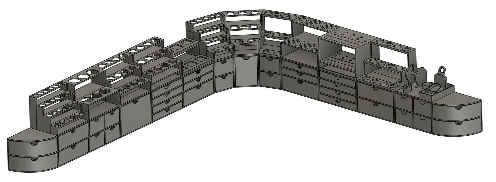 Các mặt trên bổ sung bao gồm trạm hàn vòng bi 608, giá đựng dụng cụ máy in 3D, hộp đựng bút màu Cricut và giá đỡ cọ vẽ.