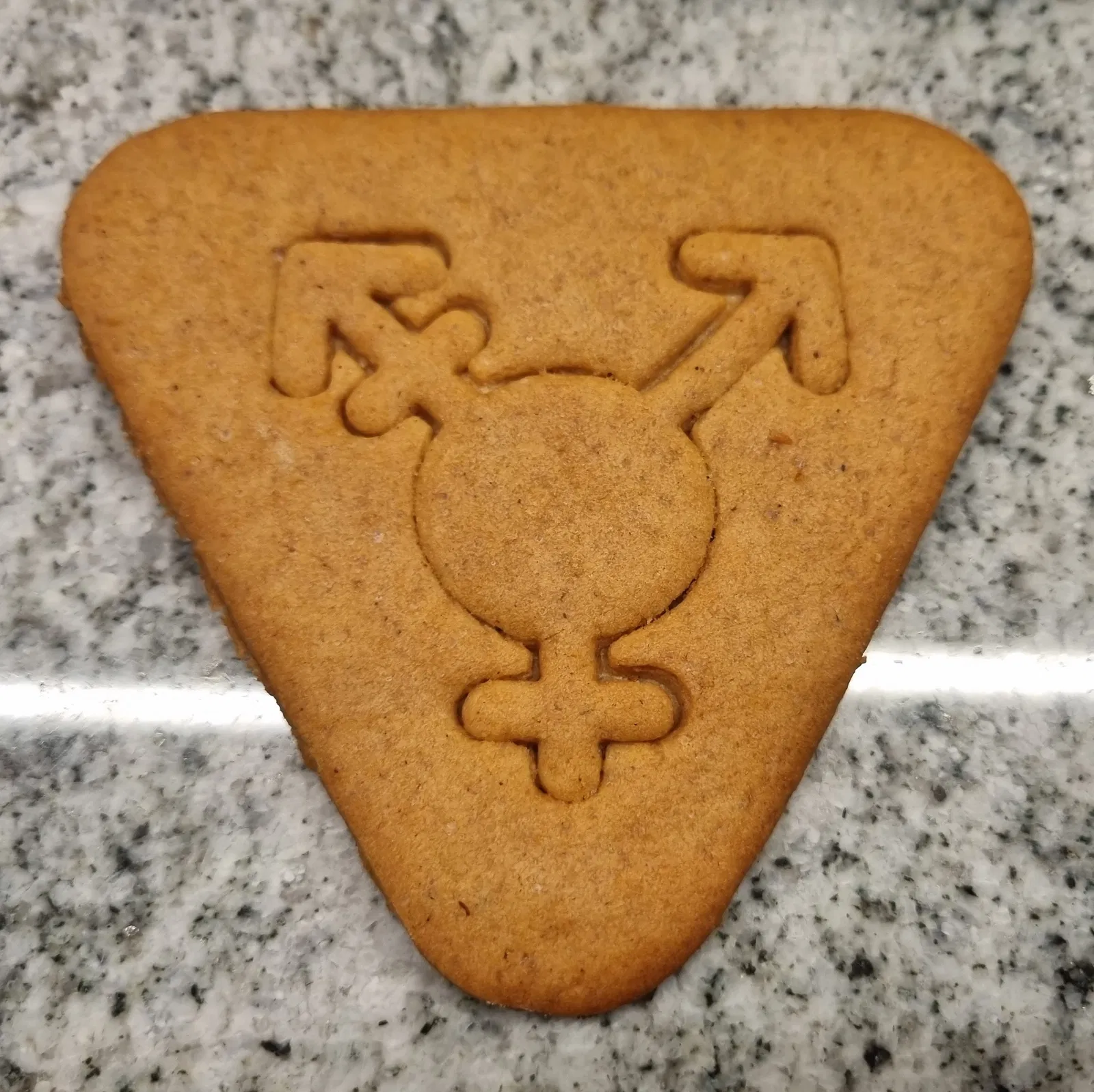 Khuôn cắt bánh quy cơ bản có biểu tượng người chuyển giới. Có hai phiên bản. Một phiên bản cắt hoàn toàn biểu tượng bên trong và một phiên bản chỉ tạo hình biểu tượng dưới dạng phù điêu (nông). Bánh gừng trong ảnh được làm bằng khuôn cắt hết và phần bên trong được giữ lại trong quá trình nướng.
