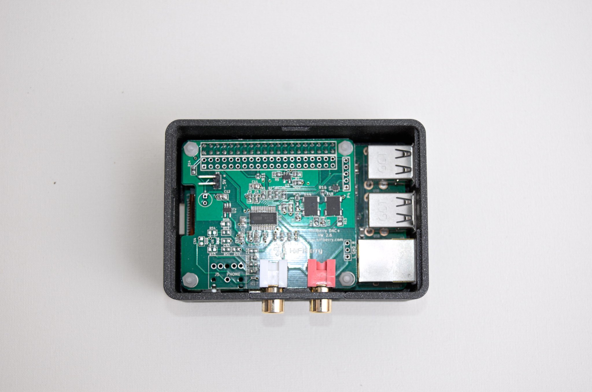 Đặt 4 ốc nylon vào các lỗ dưới vỏ. Đặt bảng RPi lên vỏ sao cho các lỗ khớp với ốc. Sau đó vặn các đệm lại. Vì khó khăn khi giữ tất cả 4 ốc cùng một lúc, hãy thử từng cái một. Sau khi tất cả các đệm đã được đặt, hãy lấy nắp RCA in 3D và đặt nó lên các RCA rồi gắn HiFiBerry DAC bằng cách ấn nhẹ để các chân GPIO ngồi đúng chỗ. Sau đó, đặt nắp trên cùng. Có một đoạn hoạt hình để hình dung quá trình, trong liên kết sau: https://www.hifiberry.com/wp-content/uploads/2019/10/HiFiBerry-Case-Assembly.mp4?_=1 Khi bạn hoàn thành việc lắp ráp máy nghe nhạc, hãy truy cập https://www.hifiberry.com/build/guides/