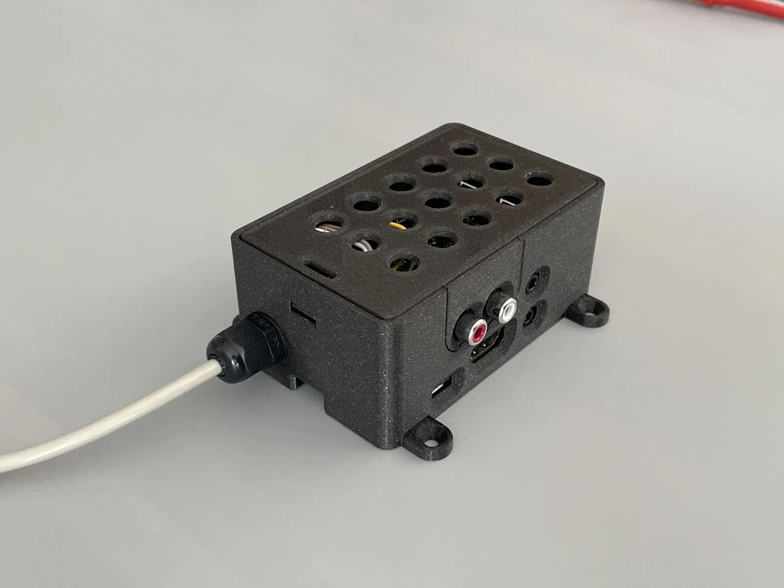 - một lỗ cho M12 cable gland đã được thêm vào để dẫn cáp dữ liệu vào vỏ hướng tới các chân GPIO, ví dụ như để kết nối các mô-đun I2C như OLED hoặc để chuyển đổi một rơ le.
