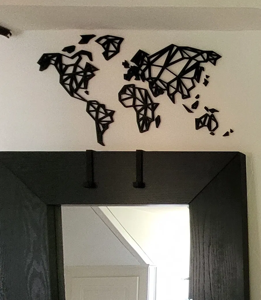 Một bản đồ thế giới độc đáo được tạo hình từ các khối đa giác đơn giản, mang đến một phong cách nghệ thuật trừu tượng và hiện đại cho không gian của bạn. Thích hợp để trang trí bàn làm việc, tường nhà hoặc làm quà tặng.