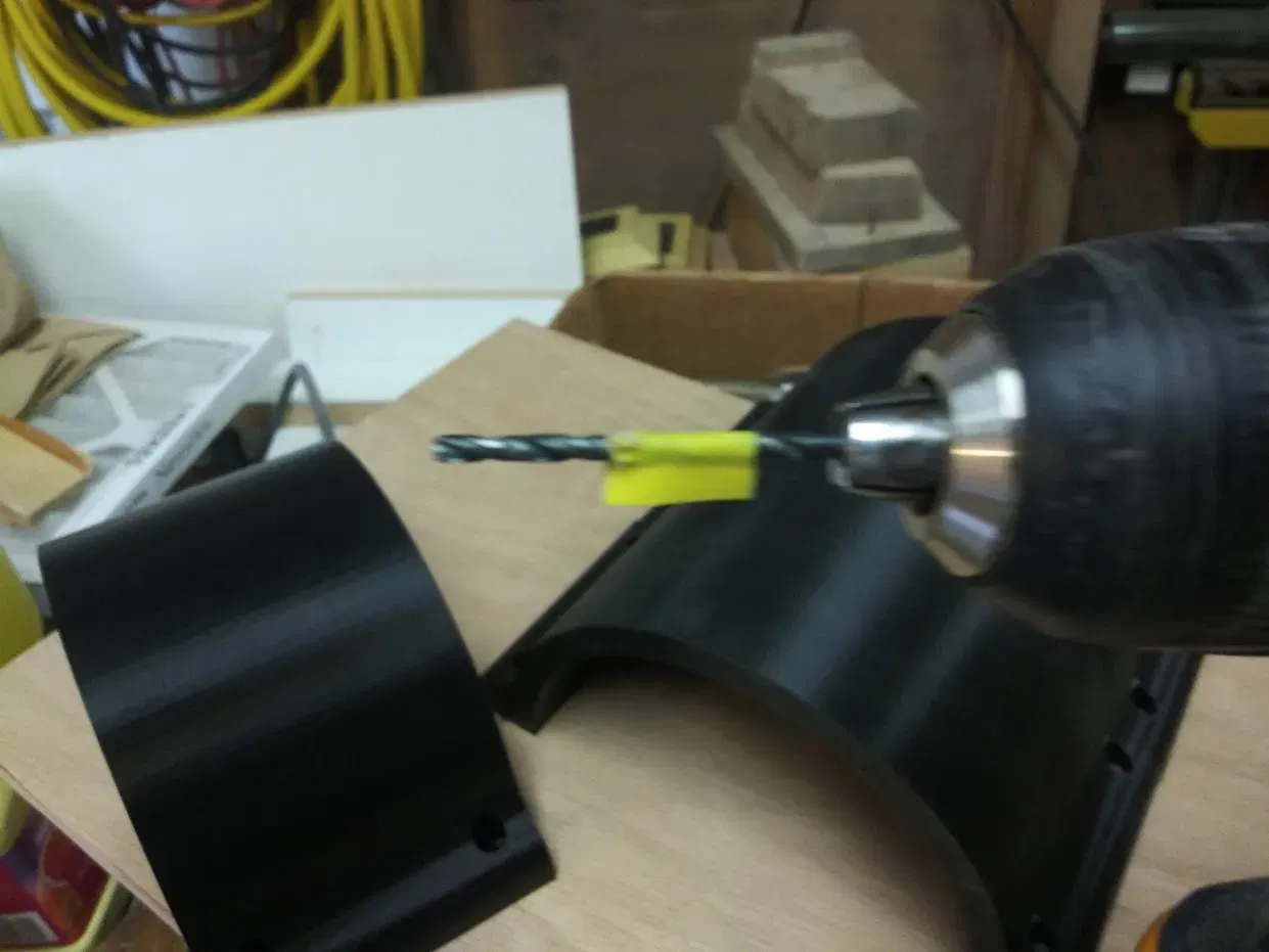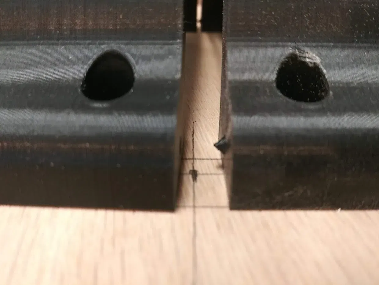 Mảnh ván ép thải ¾" mà tôi sử dụng có kích thước khoảng 30" x 12" và có 3 phần này được gắn cạnh nhau. Chúng có các chốt căn chỉnh được tích hợp ở các cạnh để giúp định vị chúng. Các lỗ vít được thiết kế cho vít thạch cao 1" nên chúng sẽ không xuyên qua hoàn toàn một tấm ván dày ¾". Tôi đã sử dụng một mảnh băng dính trên mũi khoan như một thước đo độ sâu để việc khoan lỗ trước không xuyên qua hoàn toàn vào gỗ.