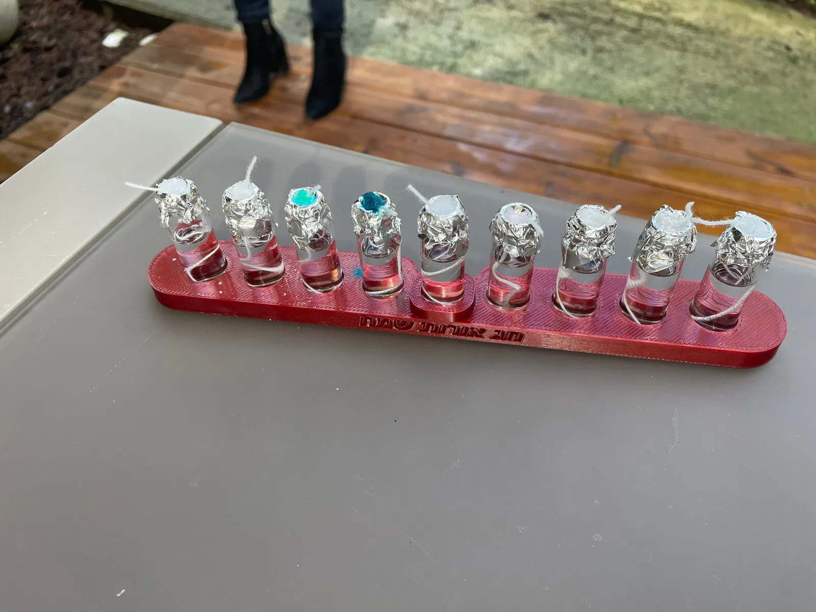 Chân đế menorah hóa học dùng để đựng lọ thủy tinh 4mL, với thiết kế nến độc đáo sử dụng cồn ethanol, nắp giấy bạc và bấc từ muối tạo ra ngọn lửa màu sắc rực rỡ. Thích hợp cho các phòng thí nghiệm và những ai yêu thích hóa học.