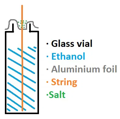 Mỗi lọ được đổ đầy cồn ethanol. Nắp được làm bằng giấy bạc, hơi lõm vào trong lọ. Một sợi dây được xỏ qua nắp nhôm để làm bấc. Tôi đã sử dụng sợi dây để niêm phong các lớp bông.