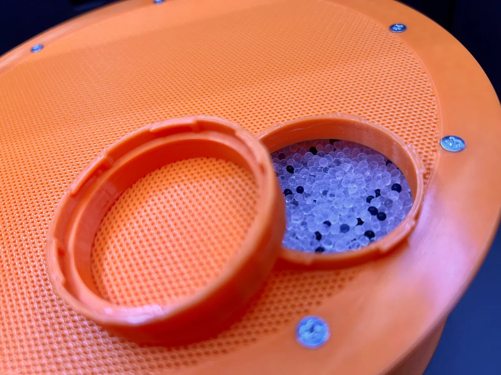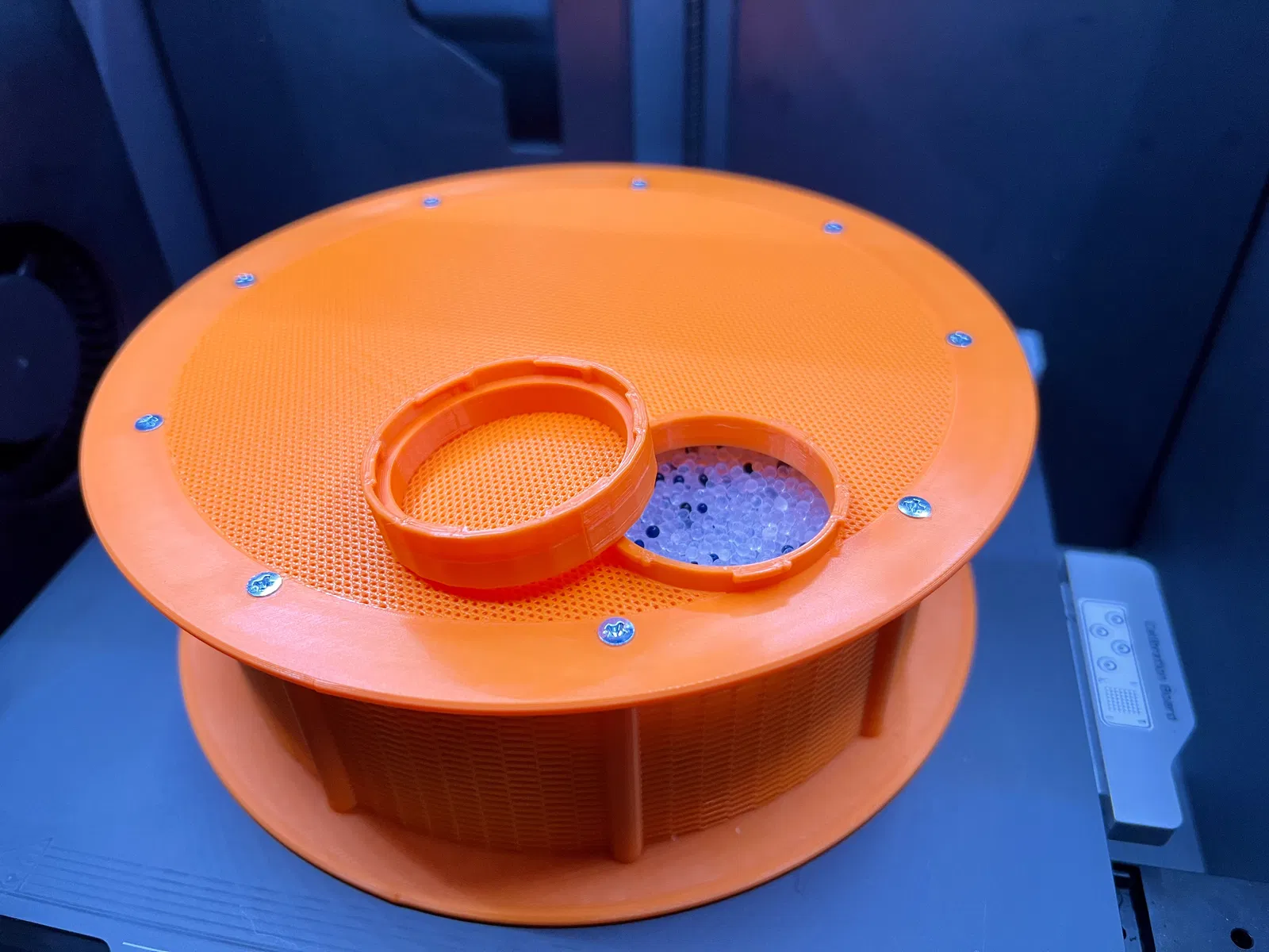 Thiết kế hộp đựng gel hút ẩm cỡ lớn theo dạng đan móc độc đáo. Hộp chắc chắn, chống đổ gel và thoáng khí, chứa được 1kg gel hút ẩm. Kích thước tương đương cuộn filament, có thể đặt vào khay AMS. Sử dụng vít M3.