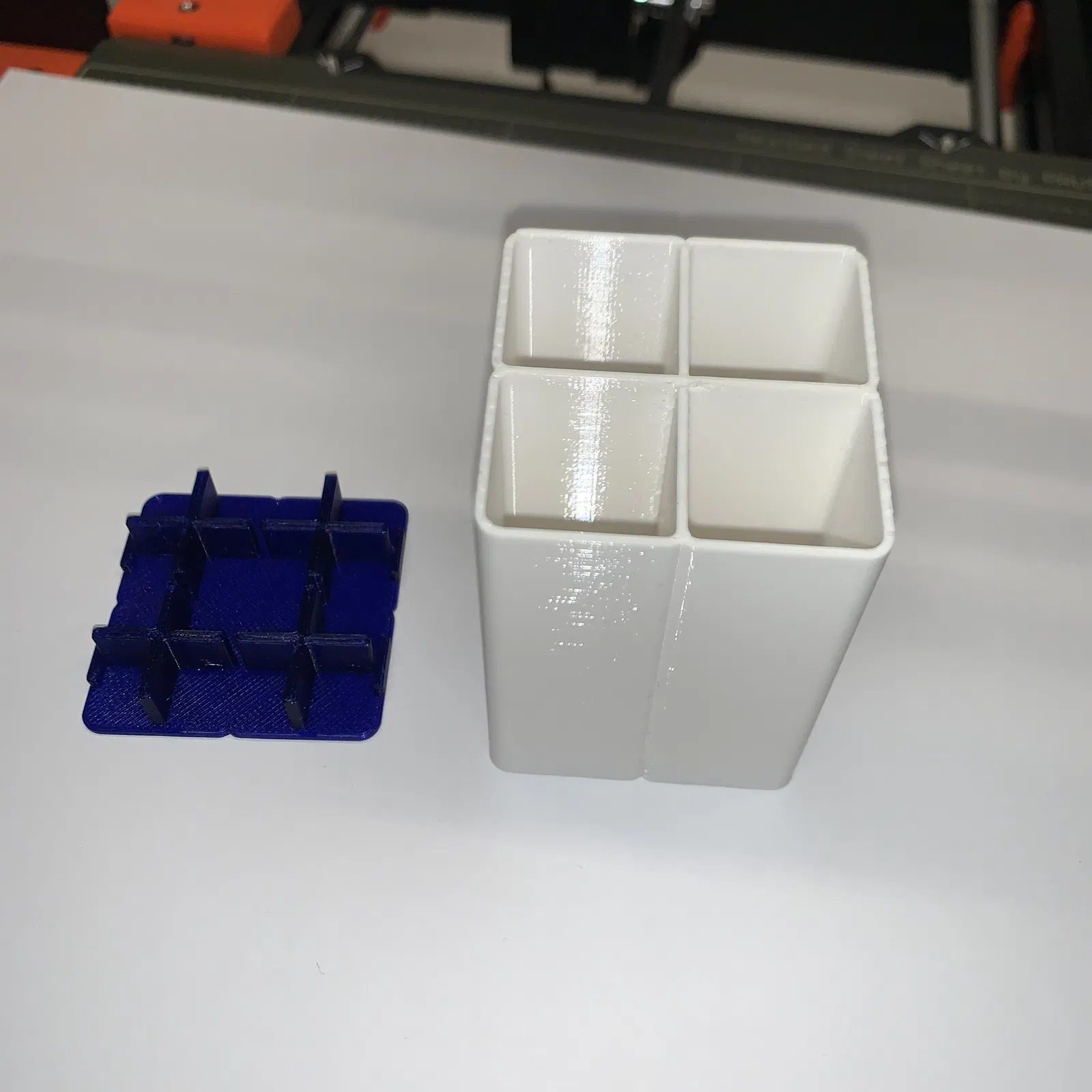 Hộp đựng đầu bàn chải đánh răng đẹp, có thể tháo rời để dễ vệ sinh. Thiết kế bởi bạn, in bởi người đăng. Minh họa bằng Prusament PETG xanh dương trong và trắng tinh.