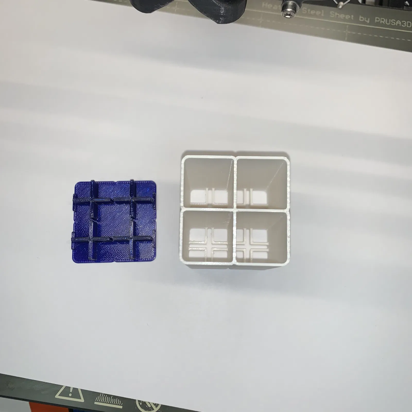 Bản in minh họa là dùng Prusament PETG màu xanh dương trong và màu trắng tinh, in với cài đặt tiêu chuẩn của Prusa.