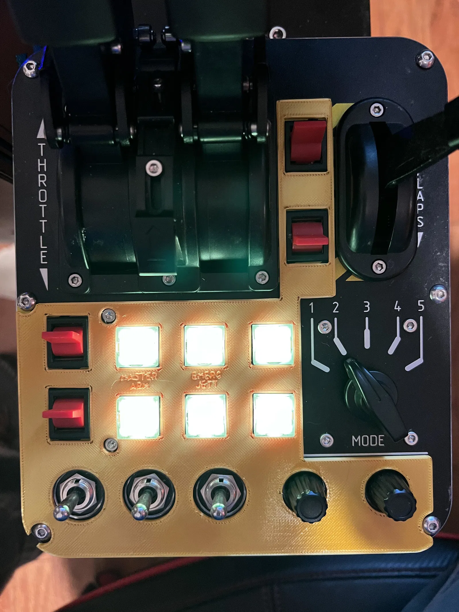 Tôi sử dụng bộ điều khiển ga của mình cho nhiều loại máy bay khác nhau trên nhiều trò chơi mô phỏng bay và không gian, và đôi khi cảm thấy khó khăn khi nhớ nút nào làm gì trên một máy bay cụ thể. Tôi đã thiết kế mặt nạ nút này để cho phép dán nhãn nút một cách dễ dàng và độc đáo, đồng thời cho phép thay đổi nhanh chóng và dễ dàng. Hiện tại, tôi sử dụng tính năng văn bản nổi (embossed text) trong Prusa slicer để thêm nhãn, nhưng máy in nhãn tiêu chuẩn, hoặc thậm chí bút dạ vĩnh cửu cũng có thể dùng được.