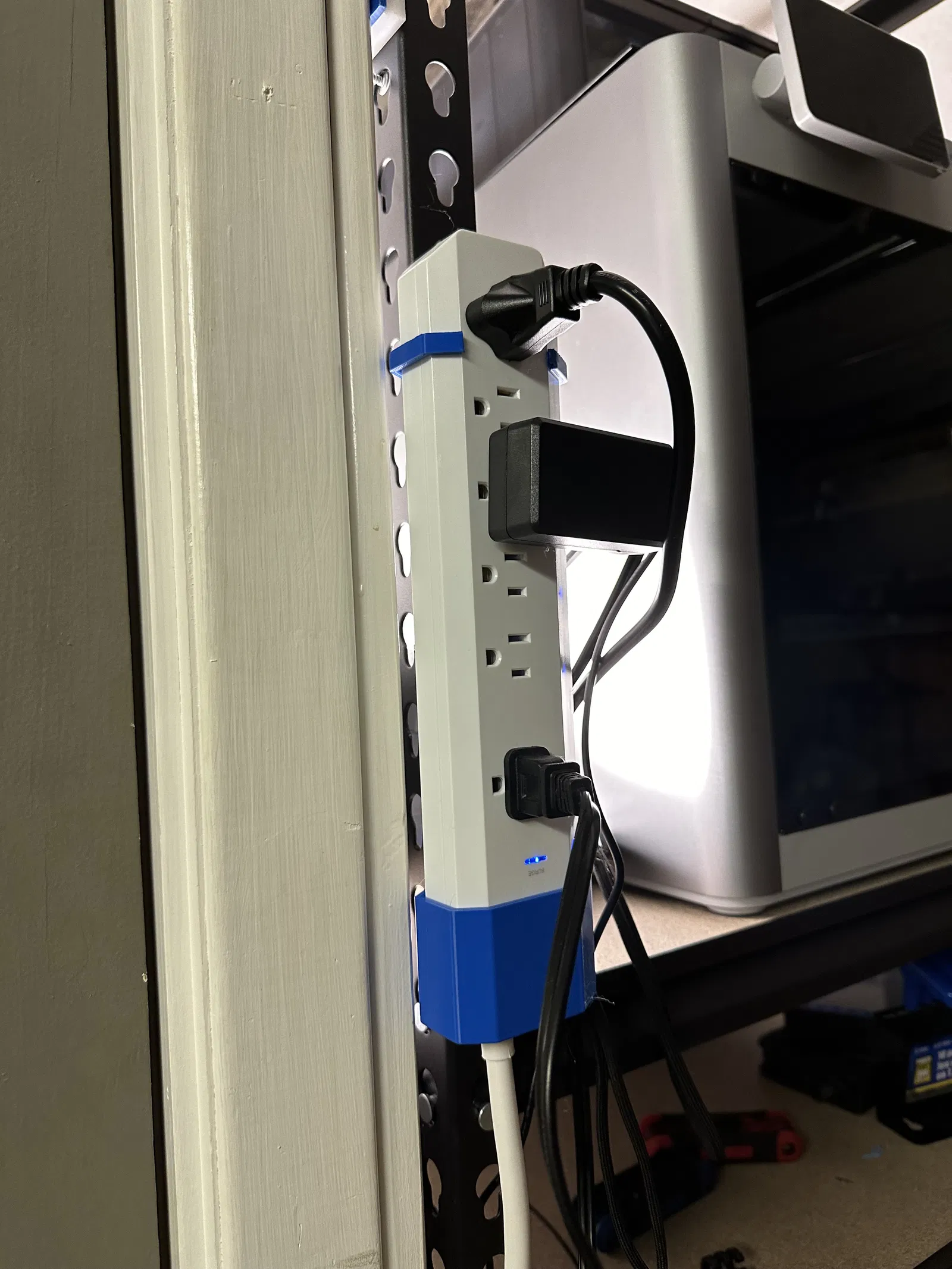 Đây là một cái đế giữ đơn giản cho Geeni Powerbar, có một lỗ thông ở dưới để luồn dây nguồn. Nó được thiết kế để gắn vừa các kệ kho hàng có lỗ hình giọt nước (tear drop) để lắp kệ. Tui dùng mấy cái kệ này cho máy in của tui á. Chúc mọi người xài vui vẻ.