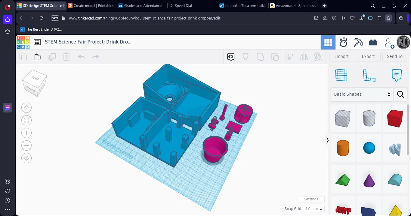 (KHÔNG CẦN CÂN CHÍNH XÁC) Đây là bản mẫu (và dự án khoa học của mình) Drink Dropper, cái máy nhỏ giọt này được in ra từ 7 bộ phận. Nó hoạt động bằng cách dùng một cái guồng nước quay bằng tay để lấy đồ uống bạn thích và thả vào cái phễu dẫn đến cái ly in 3D. Nó vô dụng đến mức bạn phải dùng nó.