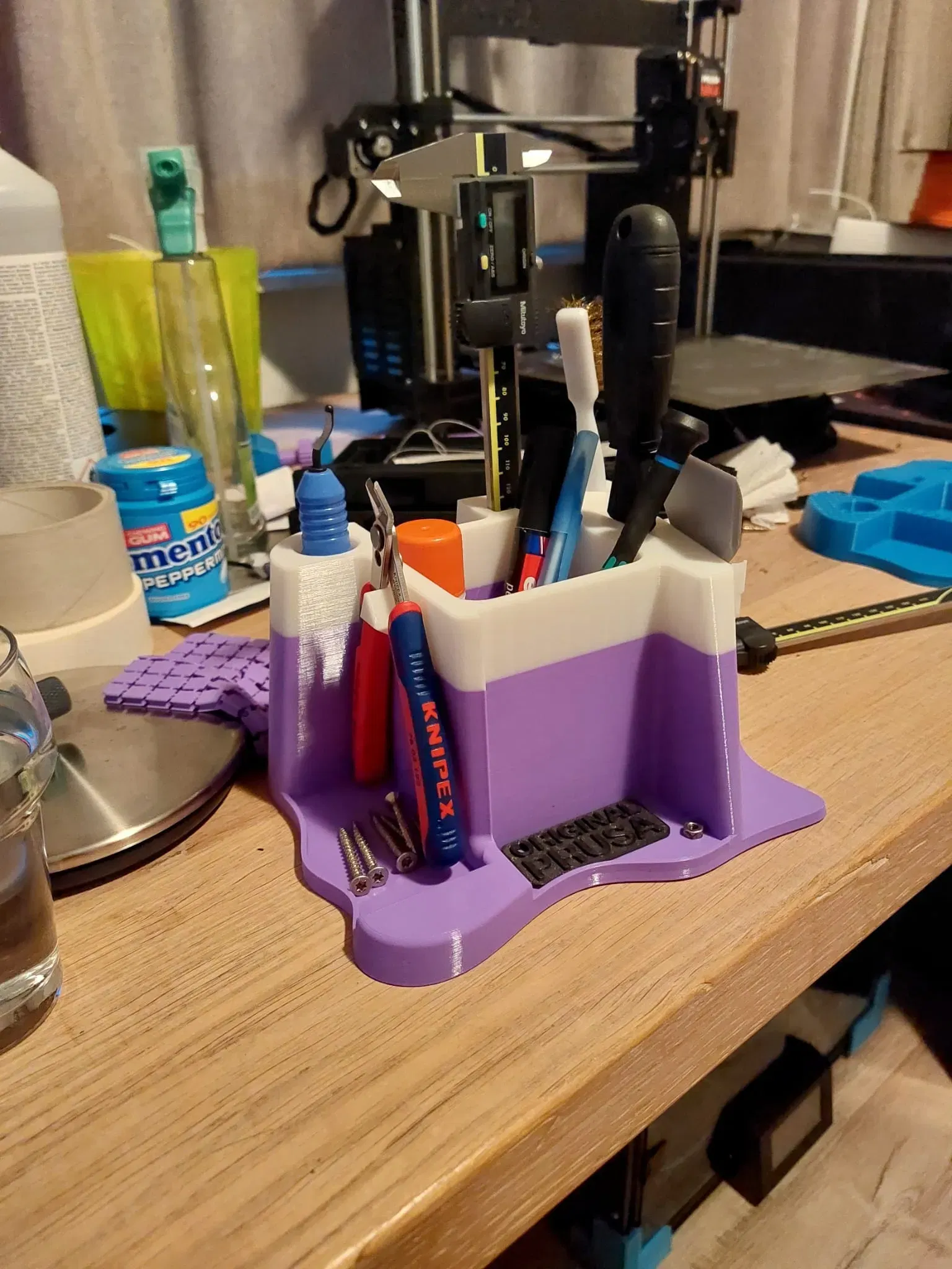 Một giá đỡ cho văn phòng phẩm và vật tư in ấn. Như thấy trong các bức ảnh, các công cụ in 3D cơ bản phù hợp với giá đỡ này. Và cũng có chỗ cho bút chì, vít và đai ốc.
