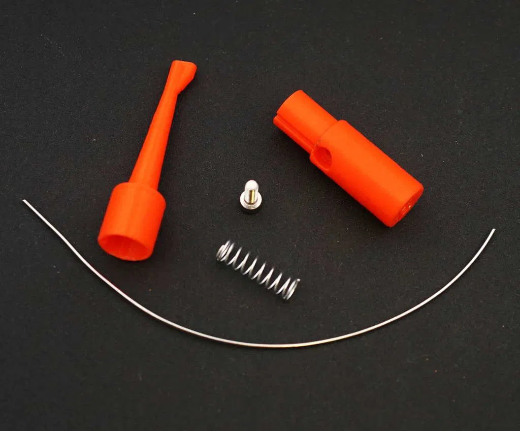 Nó sử dụng một đoạn dây (đường kính 0,8 đến 1mm), một vít M3 8mm và một lò xo (đường kính tối đa 8mm). Lò xo bút bi xài tốt.