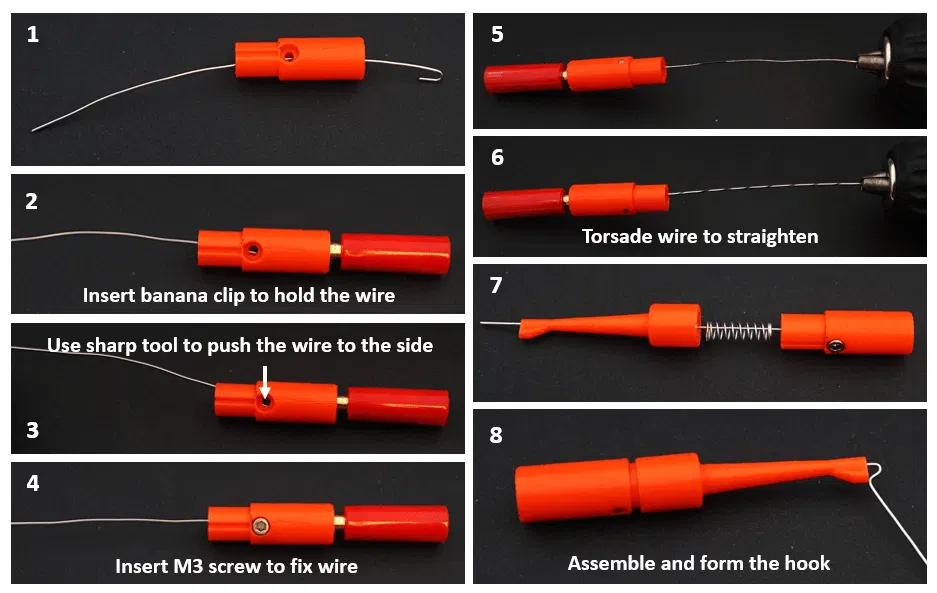 Làm theo hình minh họa trong ảnh để uốn và lắp dây. Việc xoắn bằng máy khoan rất quan trọng vì nó không chỉ làm thẳng mà còn làm chắc dây bằng cách làm cứng do làm việc.