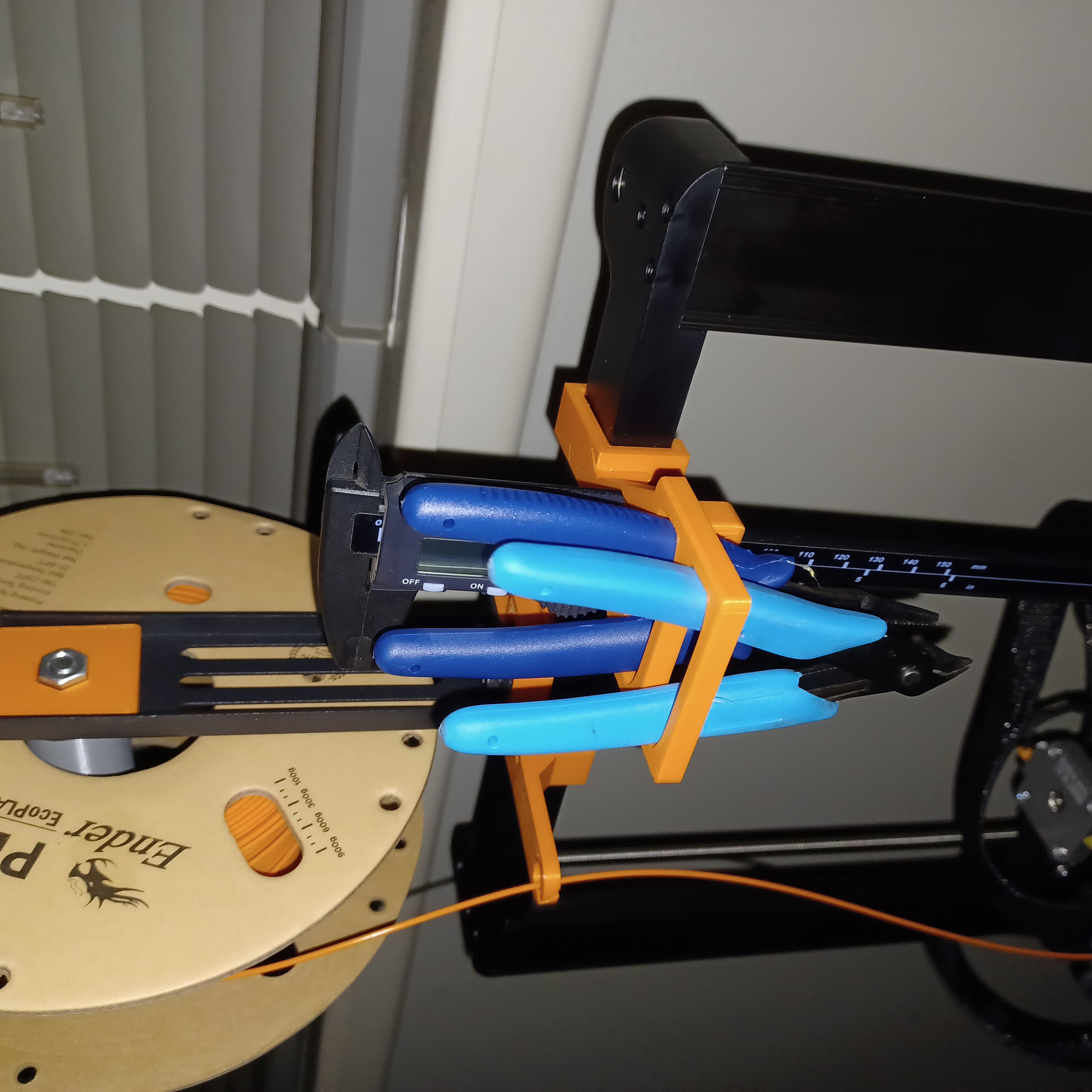 Cái kẹp giữ đồ của bản gốc thì tuyệt vời, giúp giữ mấy cái kềm cắt của tui gần tay để thay dây tóc... Nhưng rồi tui lại thấy mình phải đi tìm mấy cây kềm mũi dài với thước cặp sau khi in xong để gỡ mấy cái support với kiểm tra lại công việc.