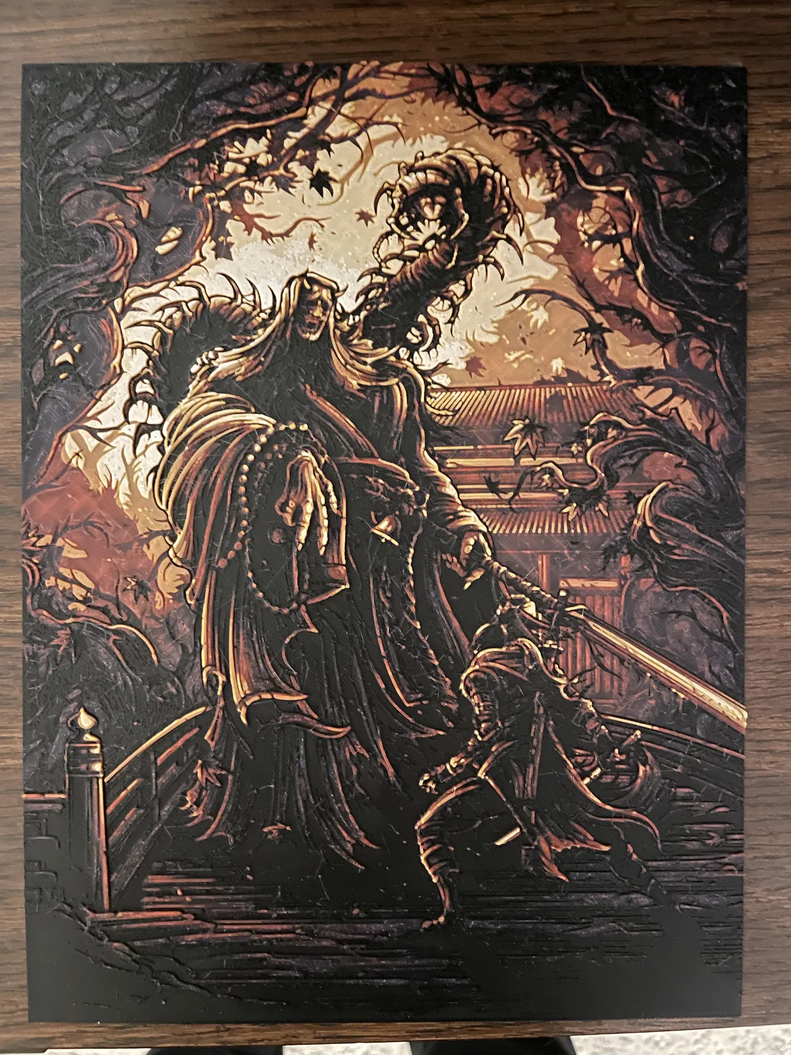 Poster Sekiro: Shadows Die Twice HueForge, in ấn chi tiết với nhiều màu sắc. Hướng dẫn in và đổi màu chi tiết cho PLA+, bao gồm các màu Black, Purple, Red, Yellow và White. Tỷ lệ in 100% infill, độ cao lớp 0.08mm.