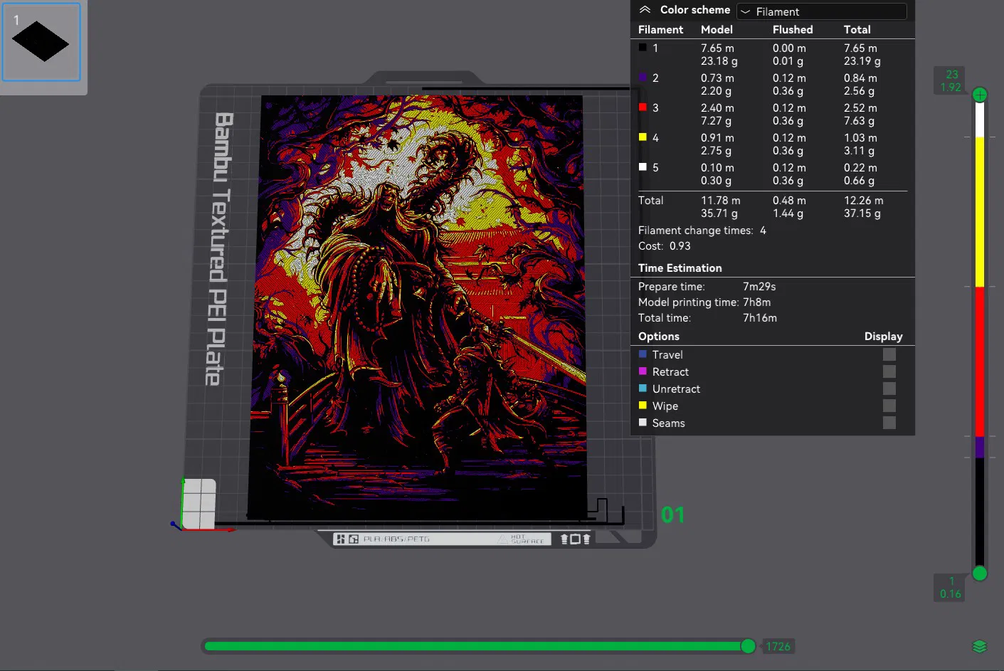 Hướng dẫn đổi màu: Bắt đầu với Black Ở lớp #6 (0.56mm) đổi sang Purple Ở lớp #7 (0.64mm) đổi sang Red Ở lớp #14 (1.2mm) đổi sang Pure Yellow Ở lớp #21 (1.76mm) đổi sang White cho đến hết.