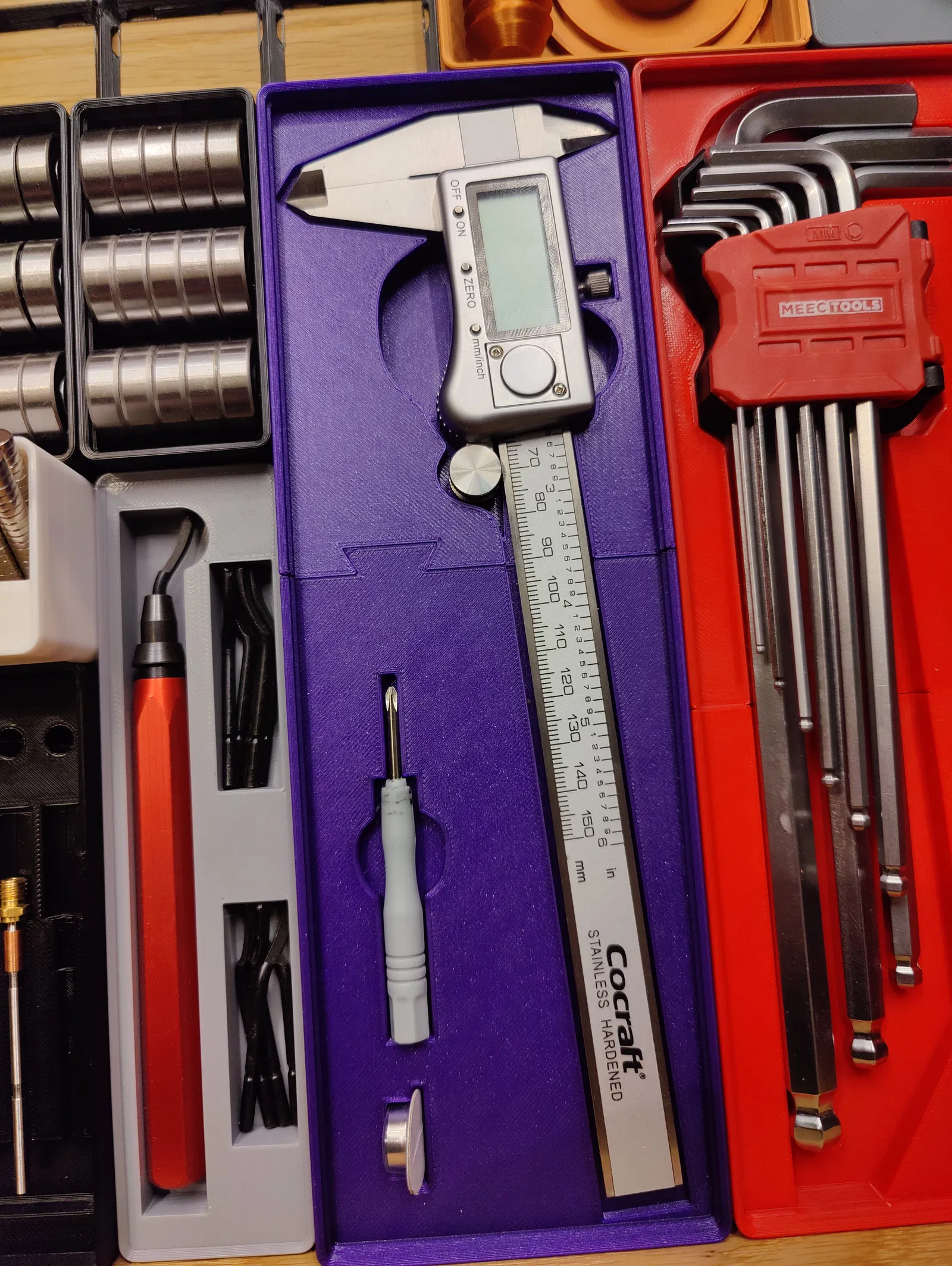 Hộp Gridfinity đựng thước cặp và phụ kiện. Có phiên bản đã tách sẵn, phiên bản không nam châm, và dung sai 0.2mm. Thích hợp cho khổ in lớn hơn 250mm. Mẹo in ấn chi tiết.