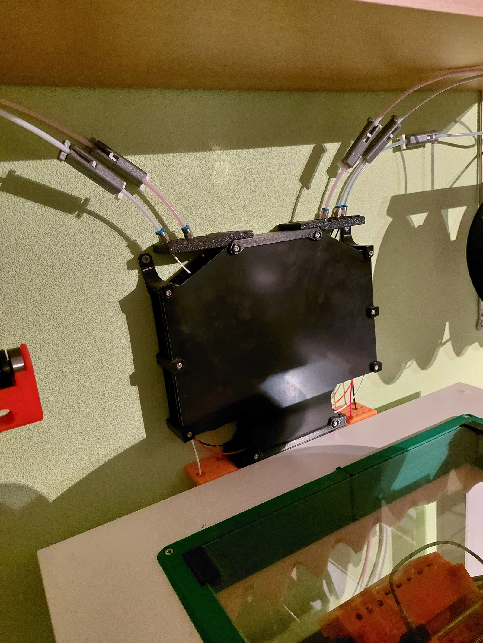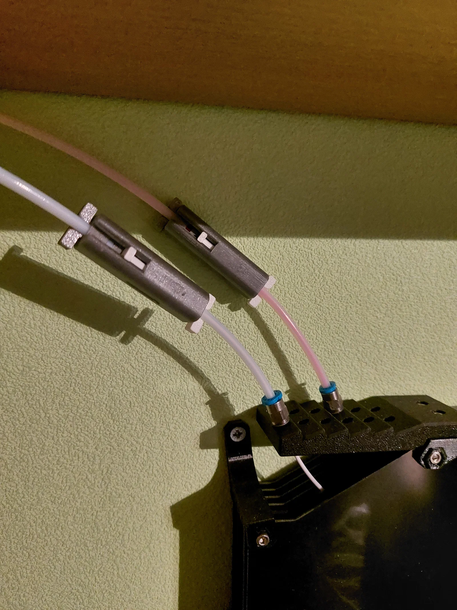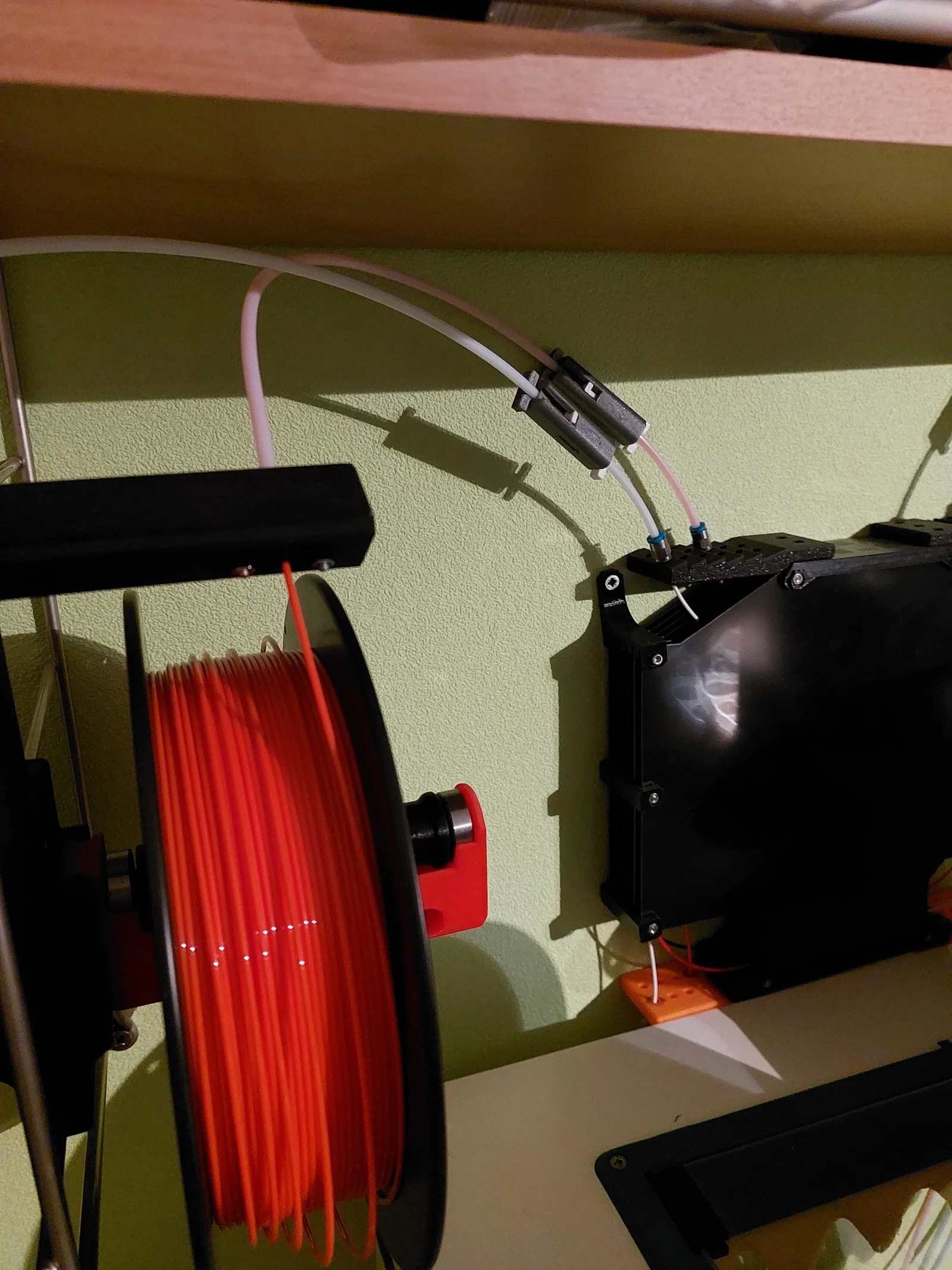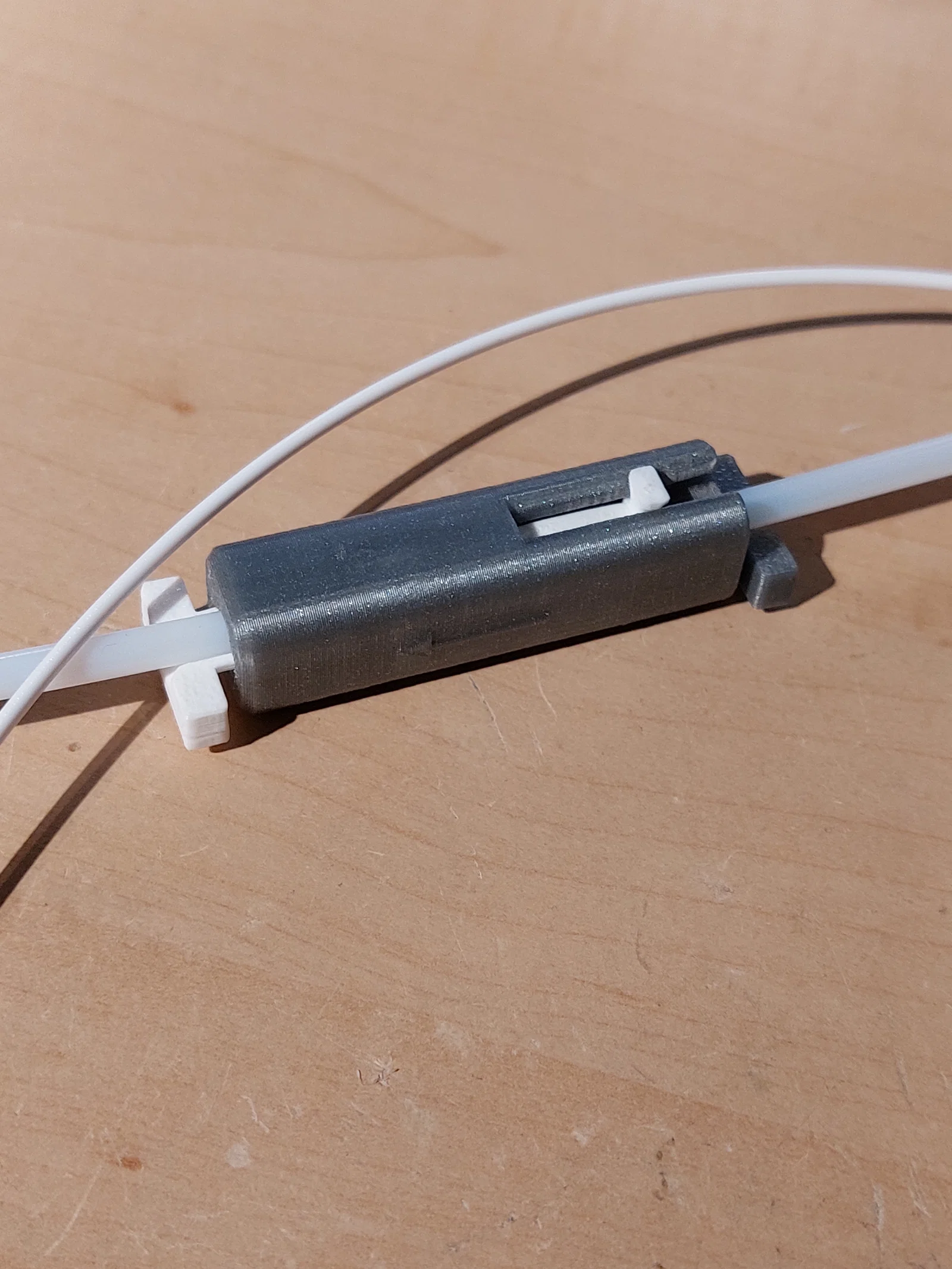 Tôi gặp vấn đề với chiếc MMU2S của mình đẩy filament ngược lại qua bộ đệm filament và làm rối filament quanh cuộn, làm hỏng bản in, nên tôi đã thiết kế van một chiều cho filament này. Nó chỉ cho phép filament đi qua theo một hướng và ngăn không cho nó bị đẩy ngược lại. Để rút filament ra khỏi van bằng tay, bạn có thể ngắt kết nối cơ chế bằng cách nhấn nút nhả.