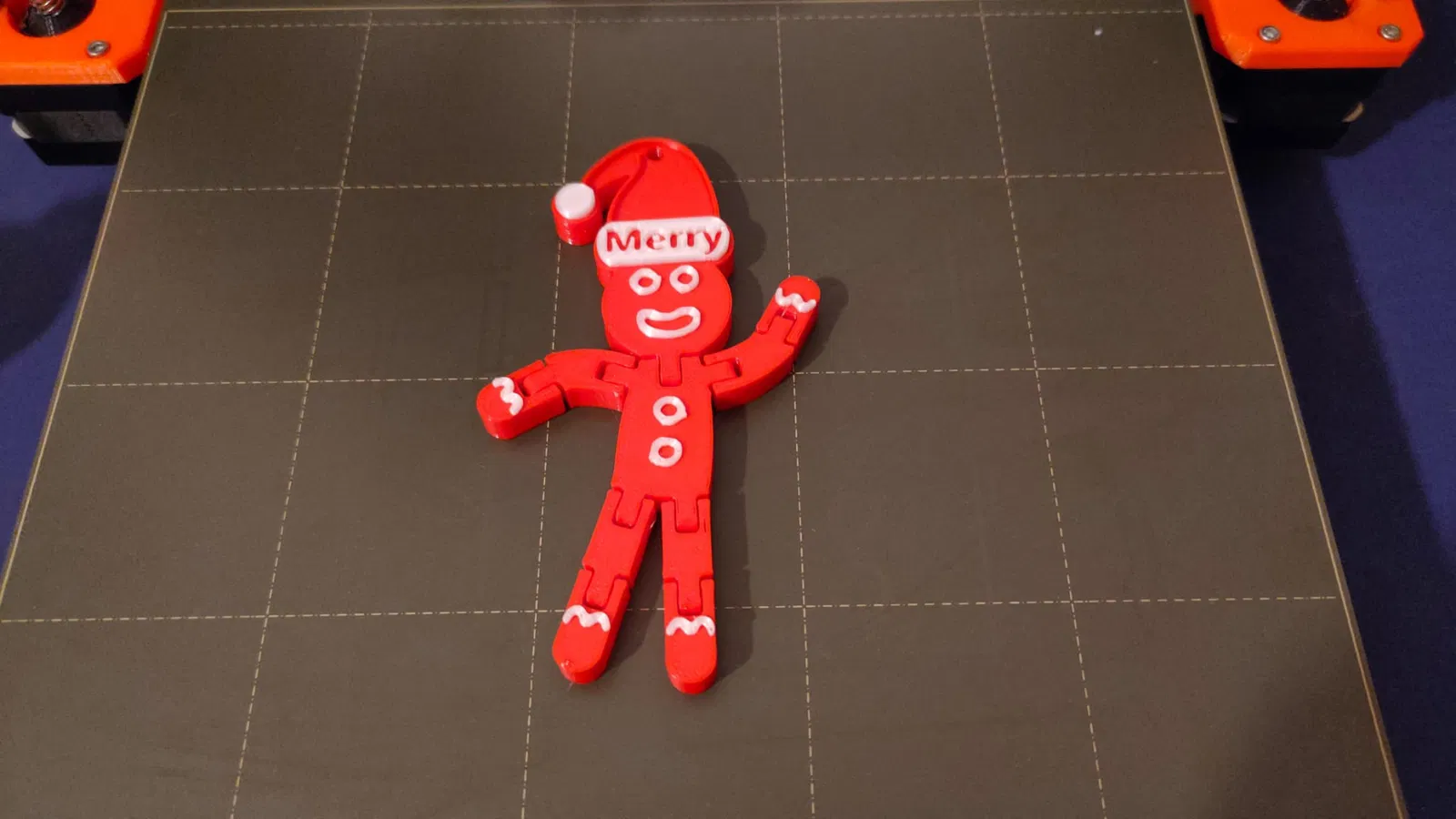 Mô hình bánh gừng kết hợp với mũ Giáng sinh, có khả năng cử động khớp nối độc đáo. File 3mf đã bao gồm tùy chọn đổi màu, cùng với các bản cập nhật file G-code và phiên bản có bộ điều chỉnh văn bản cho nhiều loại máy in.