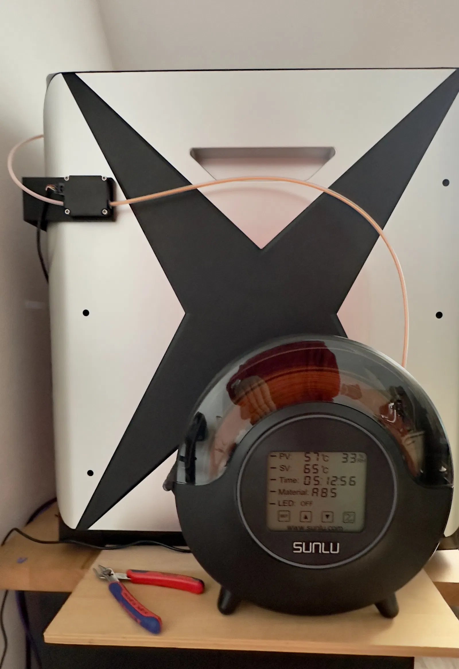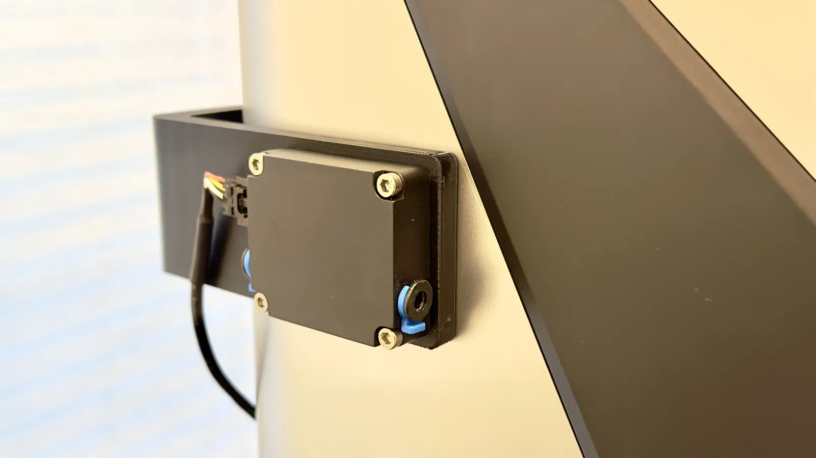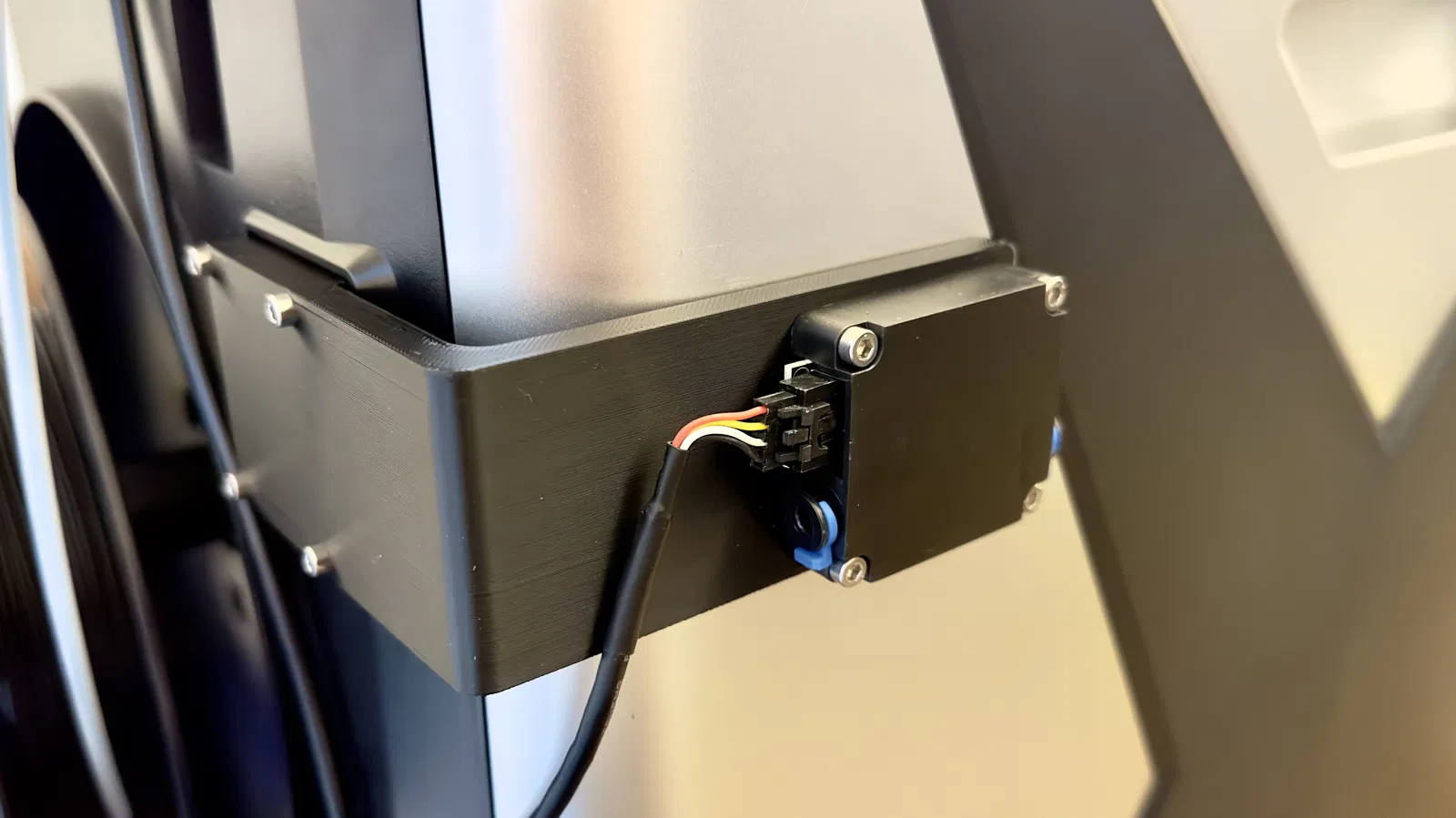 Do tui không muốn nạp nhựa cho Qidi X-Max 3 từ phía sau hoặc bên trái, mà vẫn muốn xài cảm biến hết nhựa, tui đã tạo ra một cái bas chữ L nhỏ để đưa cái cảm biến qua bên hông máy in để tui có thể nạp từ phía trước.