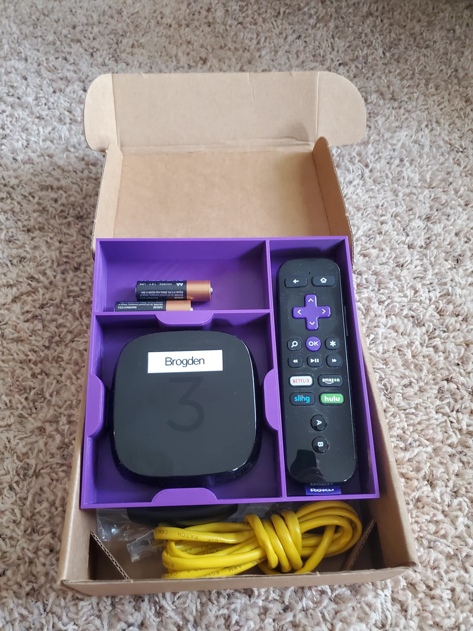 Khay đựng nhỏ gọn thay thế khay giấy carton cũ của Roku 3. Có chỗ cất pin remote, giúp bảo vệ remote khỏi bị hư do pin chảy nước. Rất tiện lợi để đựng Roku 3, remote và pin dự phòng.