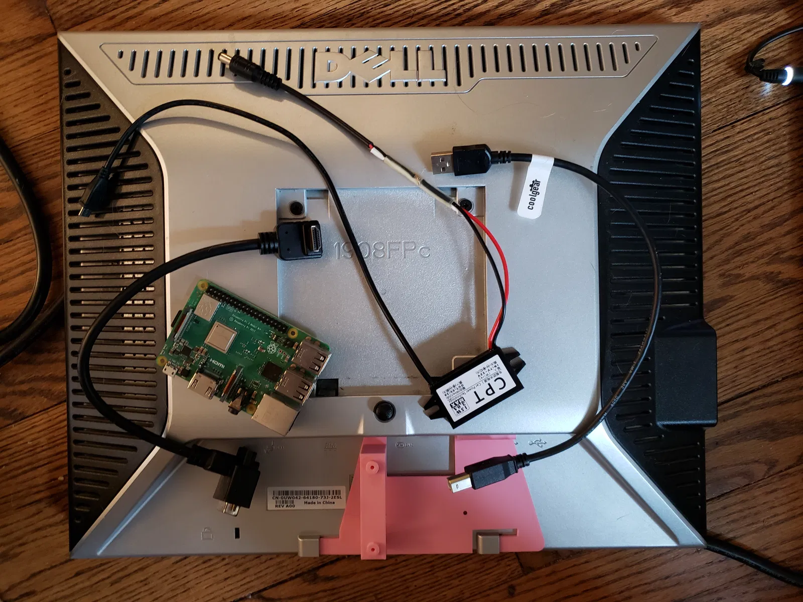Hồi đầu những năm 2000, Dell có sản xuất một loạt màn hình có loa thanh tùy chọn, chạy bằng nguồn 24w, jack cắm 12v. Những màn hình này còn có chức năng như một USB hub. Hình ảnh dưới đây cho thấy mặt sau của màn hình 1908FPc và một cái bracket in 3D, nó gài vào các ngàm loa thanh và giữ một bo mạch Raspberry Pi. Ngoài ra còn có cáp USB-B, cáp DVI sang HDMI và bộ chuyển đổi buck từ 12v sang micro USB. Khi màn hình bật lên, đầu nối 12v sẽ cấp nguồn cho Pi, rồi Pi sẽ gửi tín hiệu video và USB vào màn hình. Nhìn từ phía trước, bạn sẽ không thấy Pi đâu cả, nhưng việc truy cập Pi từ phía sau rất dễ dàng.