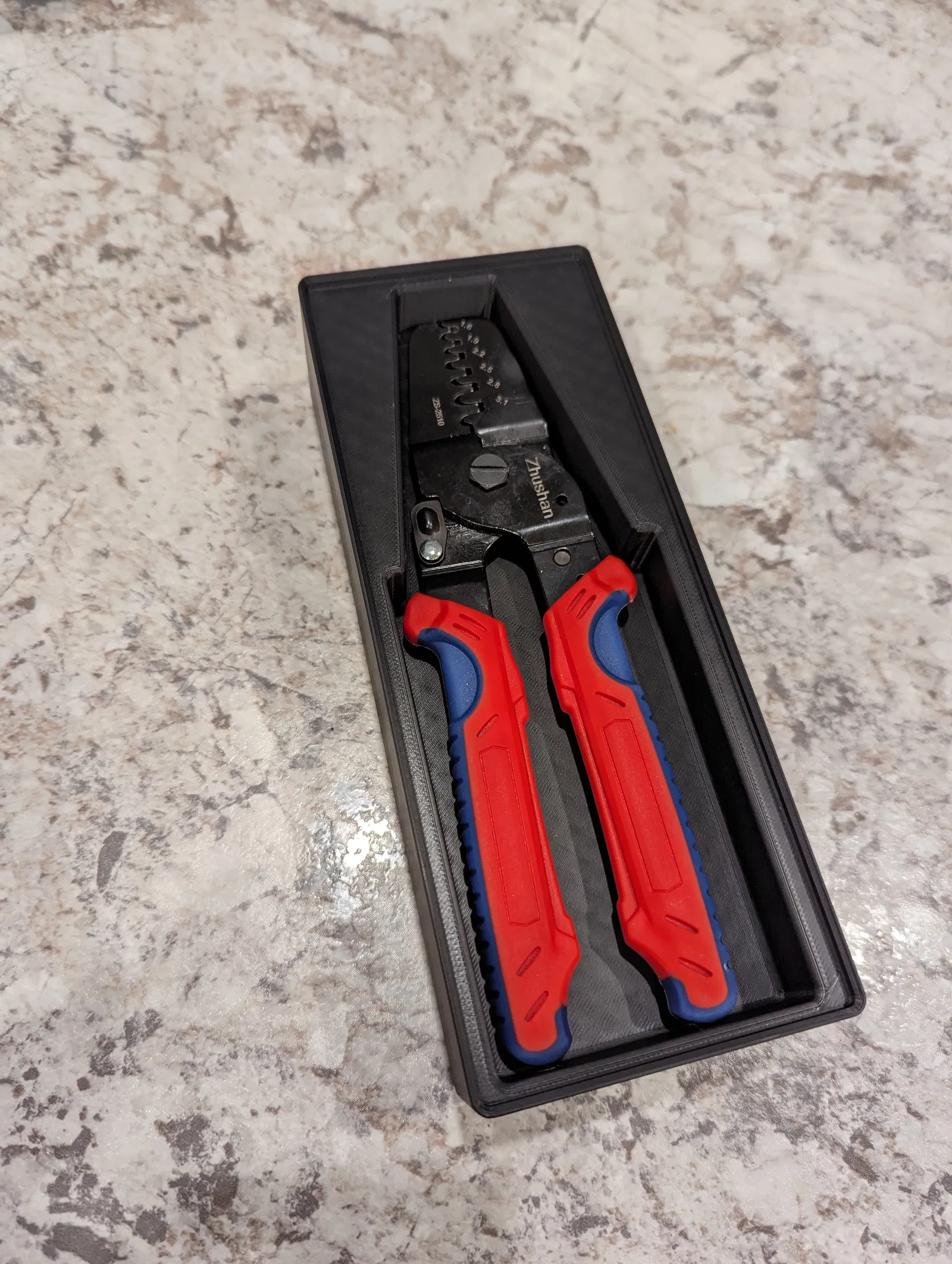 Hộp đựng đồ Gridfinity cho kìm bấm JST. Hộp này được thiết kế để giữ các loại kìm bấm JST phổ biến, giúp bạn sắp xếp không gian làm việc gọn gàng và hiệu quả hơn. Sử dụng hệ thống Gridfinity để dễ dàng tùy chỉnh và mở rộng.