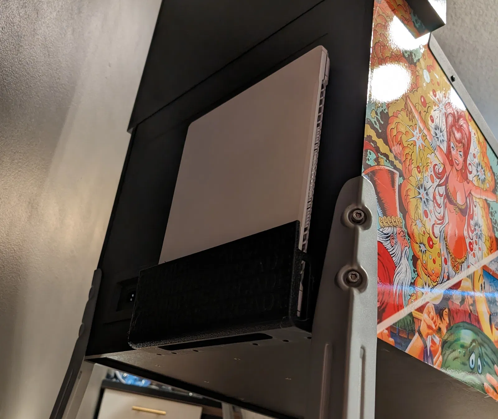 Giá đỡ laptop dọc dành cho máy pinball ảo AtGames. Thiết kế không cần hỗ trợ, có thể tùy chỉnh kích thước cho các loại laptop khác nhau và dễ dàng gắn vào thùng máy. Hoàn hảo cho người đam mê pinball ảo.