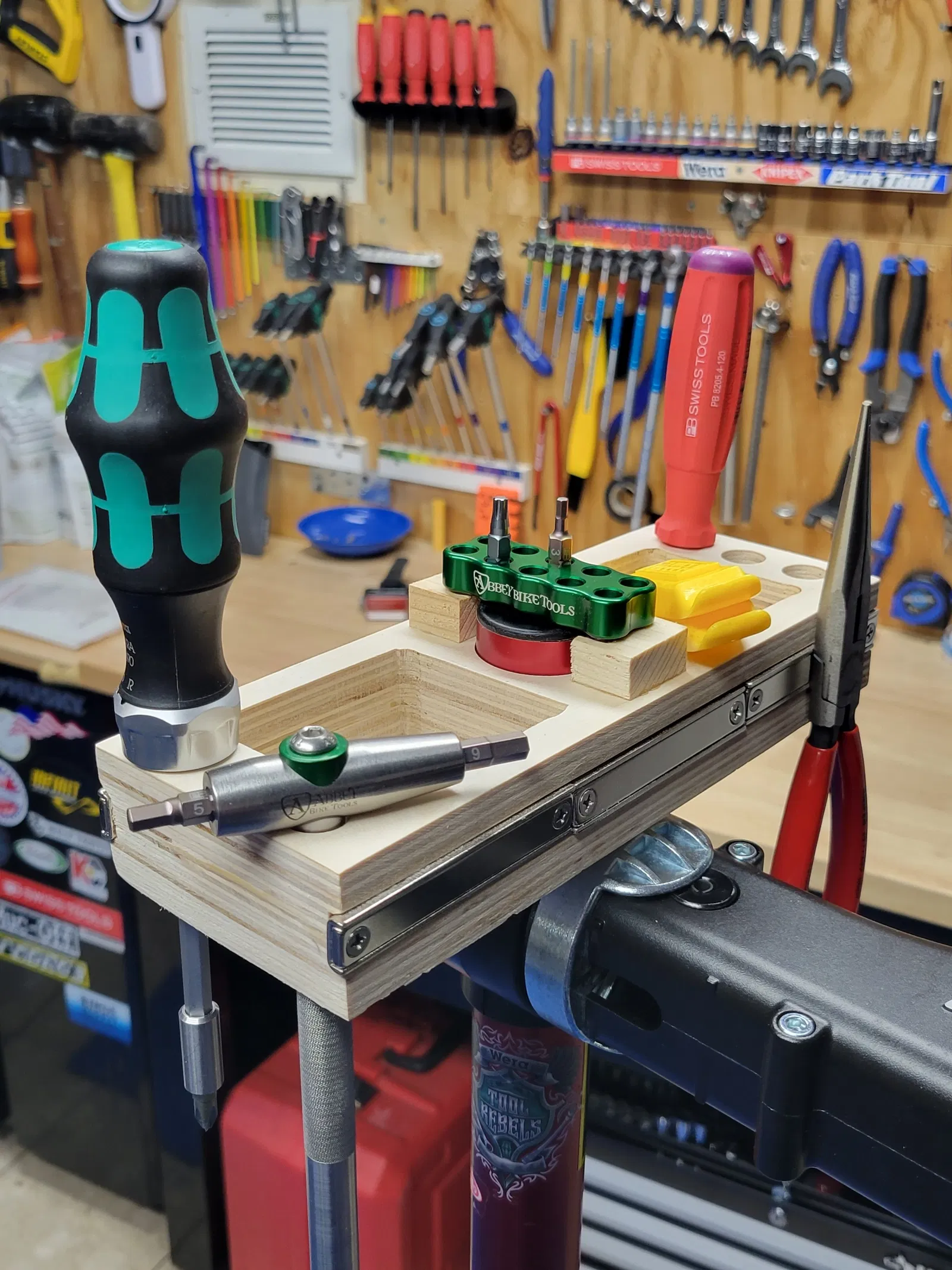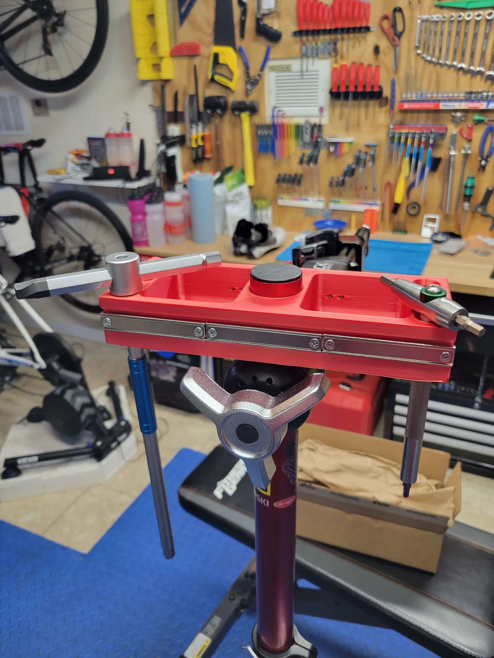 Khay dụng cụ cho chân đế xe đạp Feedback Sports, được thiết kế bởi Scot Jaworski. Có khe gắn nam châm và vừa với cọc trên cùng 38mm. Lưu ý cân chỉnh máy in và chọn kích thước vít phù hợp.