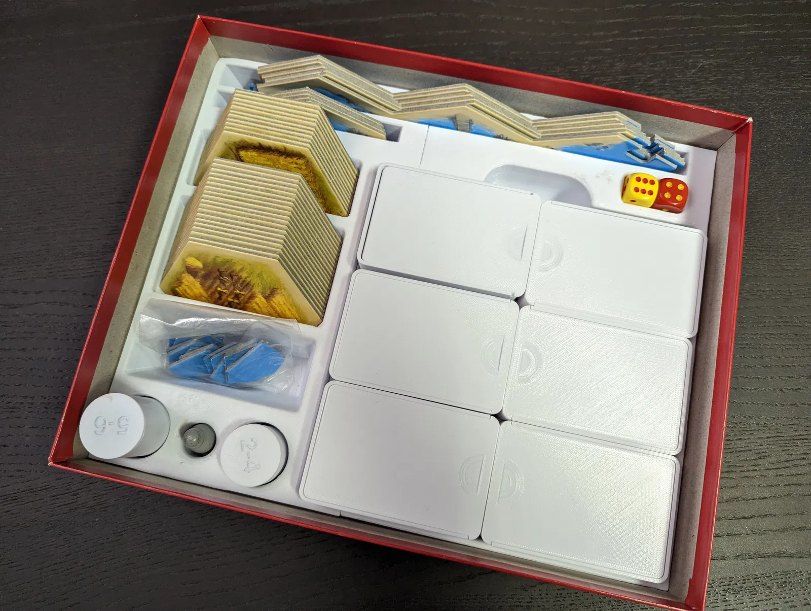 Nó có thể chứa cả bản game gốc lẫn bản mở rộng 5 & 6 người chơi, và mặc dù tui chưa thử, tui tin là nó cũng có thể chứa được bản mở rộng Knights and Cities, thêm 2 chỗ giữ thẻ cho nó.
