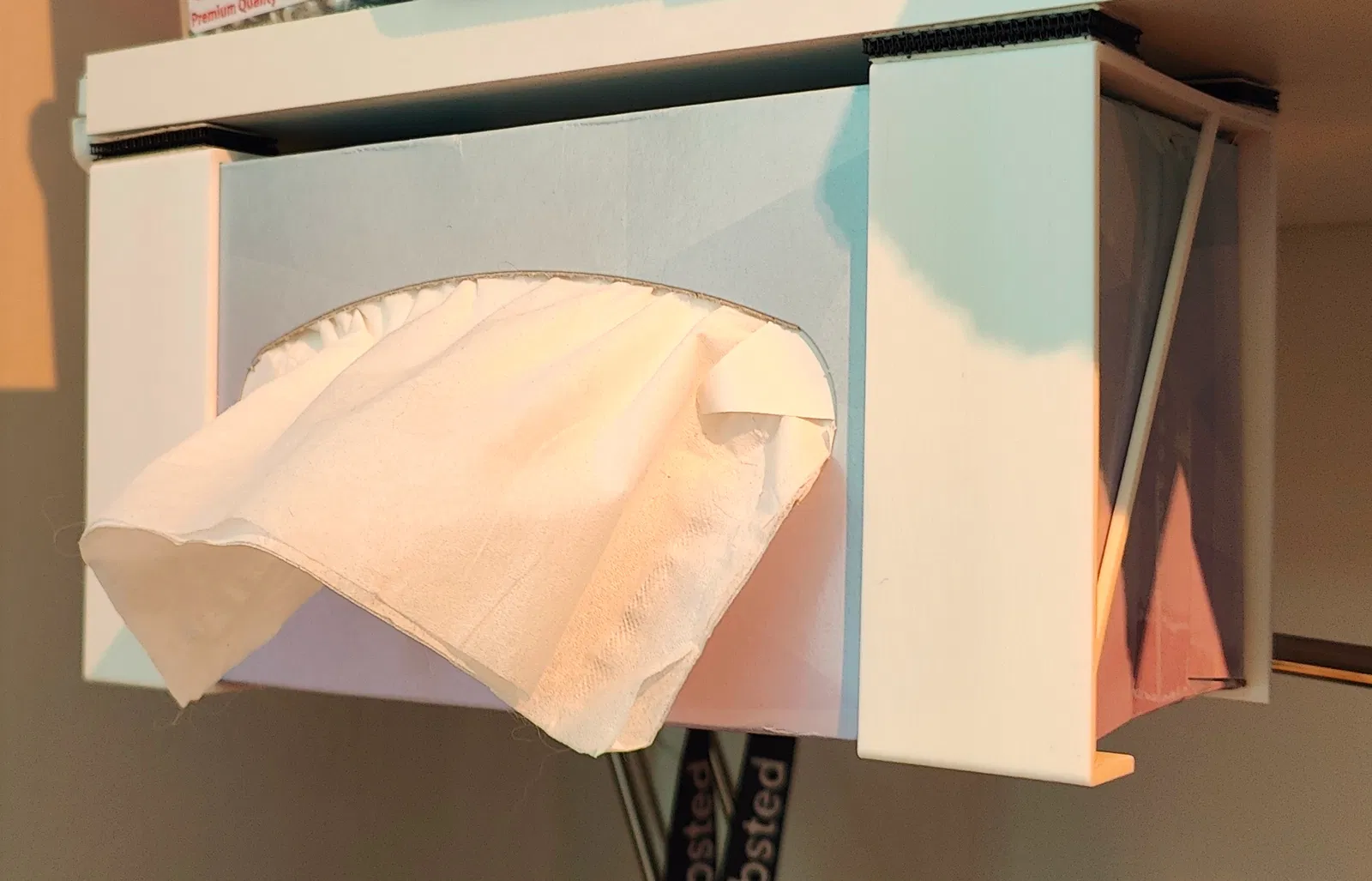 Giá đỡ cho hộp khăn giấy Kirkland Signature của Costco, có thể gắn dưới bàn hoặc kệ. Có thể dùng băng keo, băng dính gai hoặc vít để lắp đặt.