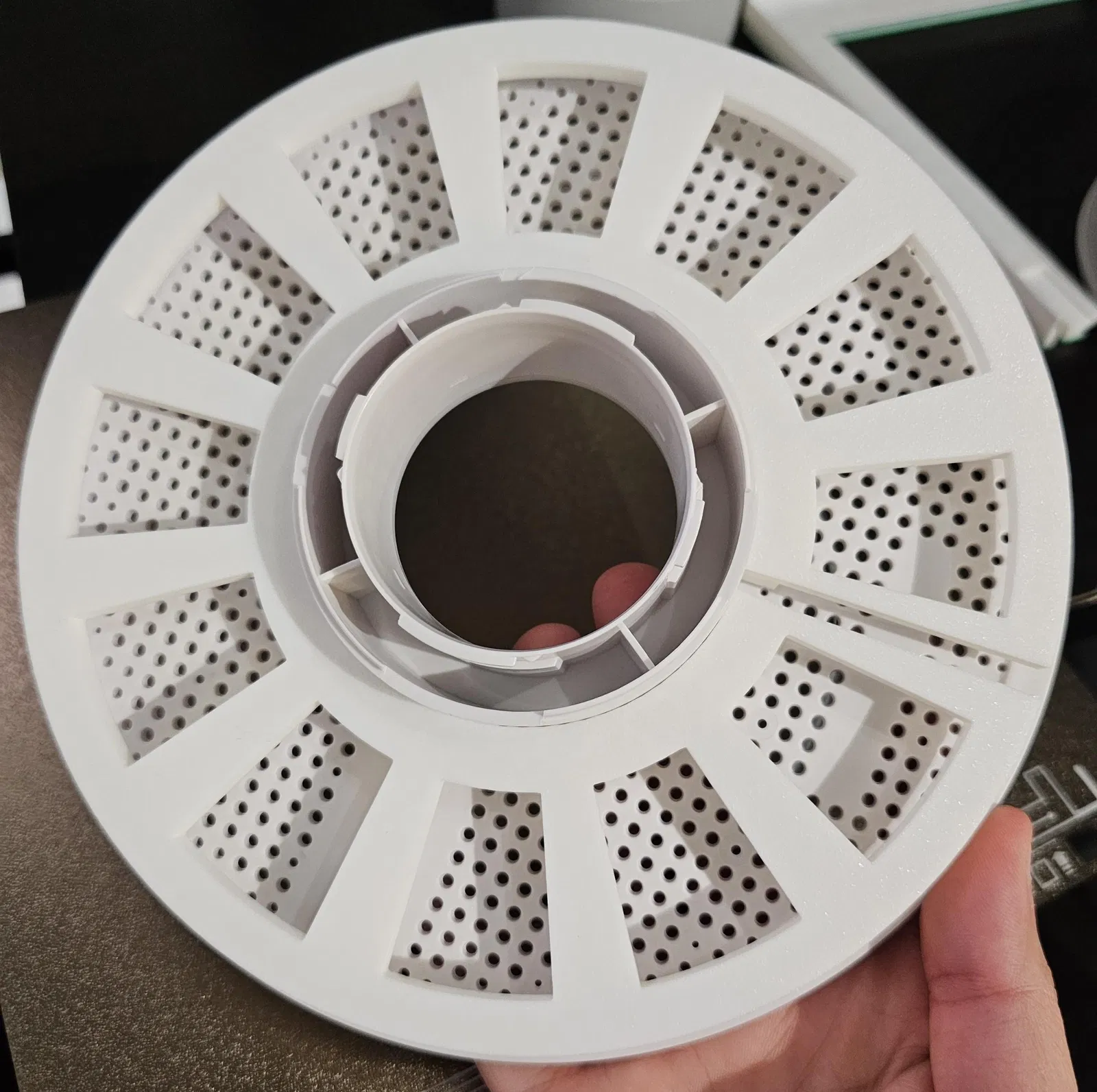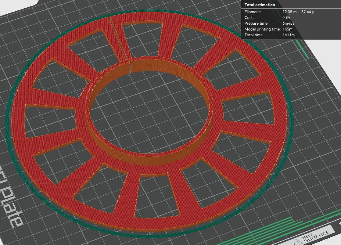 - 10% infill để dùng cuộn 750g của Polymaker lên cuộn của Bambu labs để xài trong AMS (cuộn 750g ốm hơn cuộn Bambu labs) bạn có thể xé một mặt giấy carton của cuộn polymaker ra, đặt một mặt lên một nửa của cuộn Bambu lab, gắn cái "radial space" (), lên nửa còn lại của cuộn Bambu lab thì gắn cái "width spacer" này vô, nhớ là cái mặt bự hơn thì quay vô trong nha (đừng có đẩy hết cỡ vô). xé luôn cái mặt giấy carton còn lại của cuộn polymaker, xoay hai nửa của cuộn Bambu labs lại với nhau.