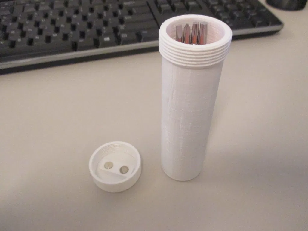 Mình đã thay đổi cái nắp để nó kín nước hơn một chút và thêm hai lỗ để gắn nam châm. Như vậy mình có thể lấy hết các đầu tua vít ra cùng lúc, hoặc để ốc vít khi tháo lắp gì đó.