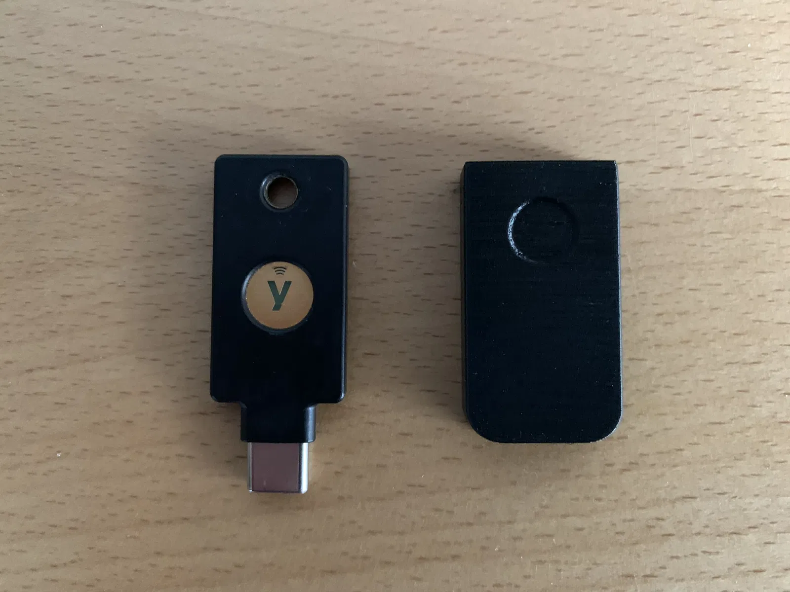 Nắp đậy vừa với chìa khóa theo một hướng với một vết lõm tròn nhỏ trên nắp để xác định mặt che phần cảm ứng/nút bấm. Điều này cho phép nắp đậy ôm chặt và giữ chắc Yubikey. Để tháo chìa khóa ra khỏi nắp, hãy kéo các cạnh mỏng của nắp.