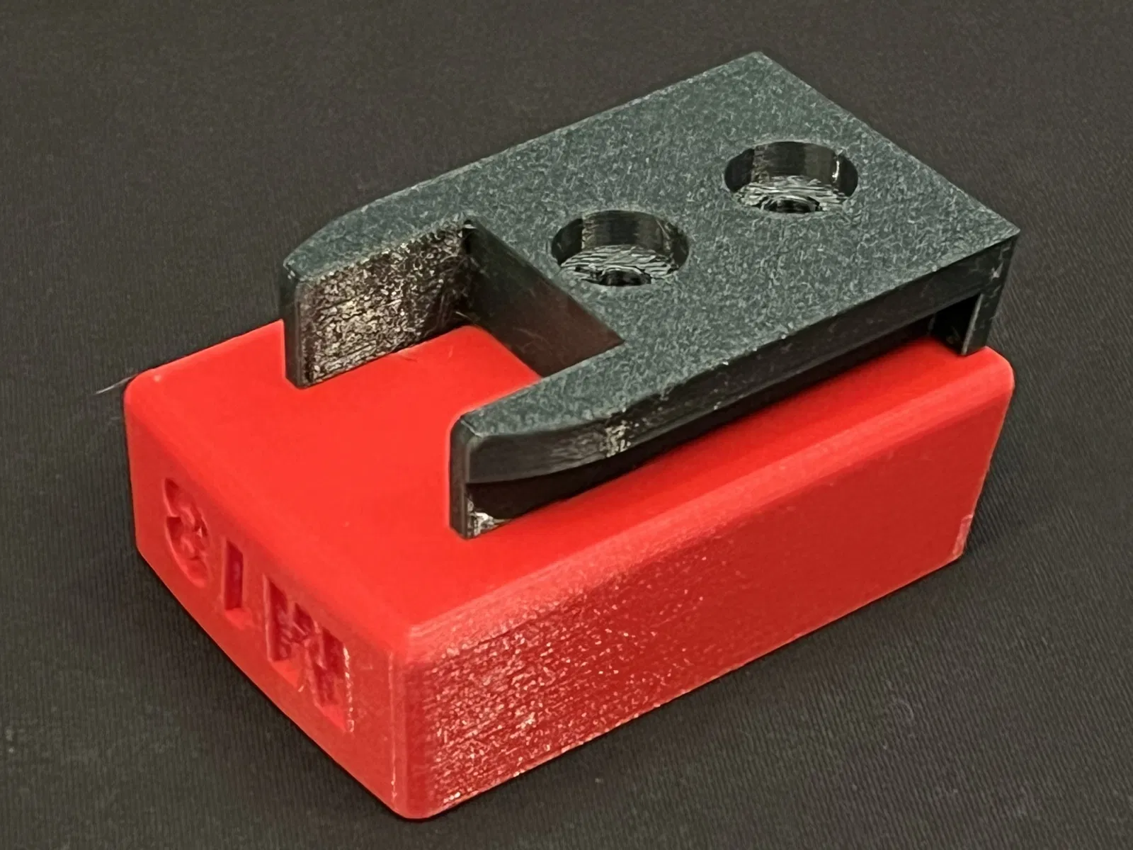 Thôi thì đây là bản của tui. In làm 2 mảnh (tui xài PETG, mảnh màu xanh lá cây xấu xí là Prusament tái chế còn mảnh màu đỏ son là Prusament Lipstick Red). Không cần support gì hết nha. Cái miếng đệm (mảnh block) cao đủ để cho cái kẹp kim loại ở thắt lưng của nhiều tool vô tư. Hai mảnh này sẽ trượt vào nhau và theo chiều dọc thì nó cứng cáp lắm khi gắn ốc vô. Ốc sẽ đỡ nguyên cái cụm này ngay trọng tâm của tool khi treo lên. Mấy cái lỗ lục giác trên mảnh block tạo nên cái nền rất chắc chắn theo đường viền thay vì theo lớp độn bên trong khi in.