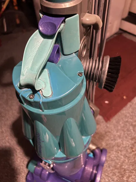 Chiếc Dyson DC07 nhà tôi vẫn xài tốt lắm mà bị gãy mấy chỗ. Có cái tay cầm của cái thùng rác nó bị bể.