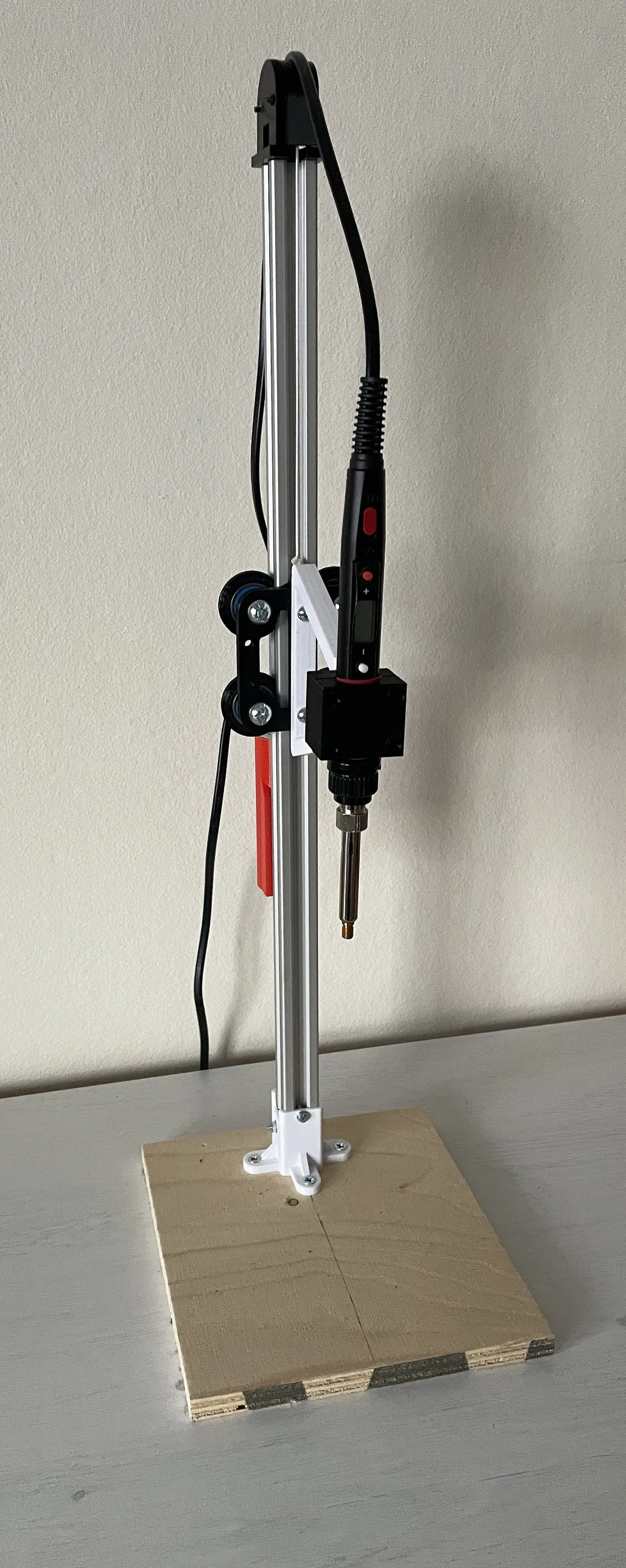 Đây là bản làm lại từ hai mẫu khác nhau. Mô hình này được điều chỉnh để sử dụng vòng bi 608 và mỏ hàn Leader Pro 80w. https://learn.adafruit.com/heat-set-rig/overview Tôi đã lấy các bộ phận khác nhau mà tôi có thể sử dụng với vòng bi 608RS. Khung con lăn 4x vòng bi 608RS 4x đai ốc m6 4x ốc m6 2x ốc vít m4 (để cố định cánh tay) Cánh tay 2x đai ốc chèn m3 2x ốc m3 10mm (để cố định giá đỡ bút hàn) Giá đỡ bút hàn 4x ốc m2.5 10mm 4x đai ốc chèn m2.5 Ròng rọc dẫn hướng 1x vòng bi 608RS 4x đai ốc chèn m2.5 4x ốc m2.5 ngắn 1x đai ốc chèn m3 1x ốc m3 (Tôi đã dùng một vài vòng đệm để cố định vòng bi) Khác Dùng dây để nối khung con lăn với bộ phận giữ trọng lượng Giá đỡ mỏ hàn 4x đai ốc chèn m2.5 kèm ốc vít Và một miếng cao su kháng nhỏ để giữ cho mỏ hàn không bị rơi ra. Hãy dùng những gì bạn có để cố định nó đúng vị trí. * Mỏ hàn https://www.amazon.de/-/en/Soldering-Professional-Adjustable-Temperature-Switch/dp/B0B1TKJSS2/ref=sr_1_1?crid=2HH5OO3E9IBSB&keywords=leaderpro%2B80w&qid=1701992828&sprefix=leaderpro%2B80w%2Caps%2C83&sr=8-1&th=1 Tôi đã dùng đai ốc có đường kính 29.9mm làm đối trọng.